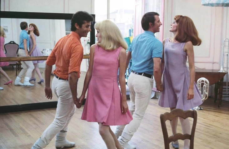 В фильме «Девушки из Рошфора» режиссер Жак Деми решает играть на сестринстве главных героинь Дельфин и Соланж (к слову, Катрин Денев и Франсуаза Дорлеак были родственницами не только на экране, но и в жизни). Несмотря на схожий стиль, их гардероб выглядит не скучно, а очаровательно, ярко и непосредственно. Дельфин и Соланж носят одинаковые шляпы с широкими полями и легкие цветные платья. В одной из сцен сестры появляются в похожих нарядах в стиле 60-х — платьях А-силуэта со складками: Соланж — в нежно-сиреневом, а Дельфин — в безупречном розовом.