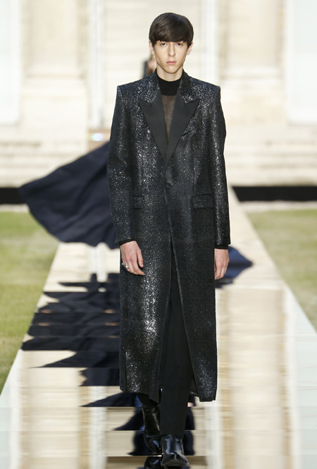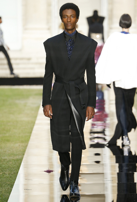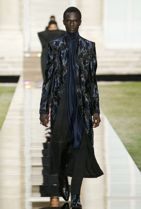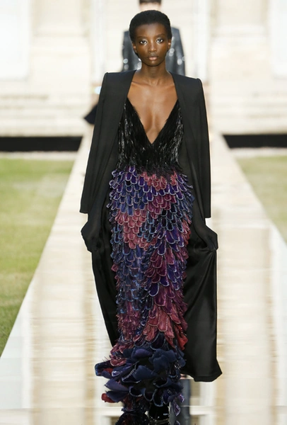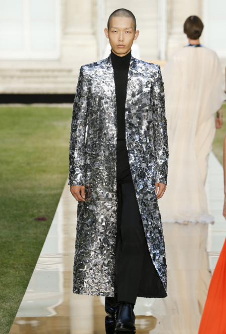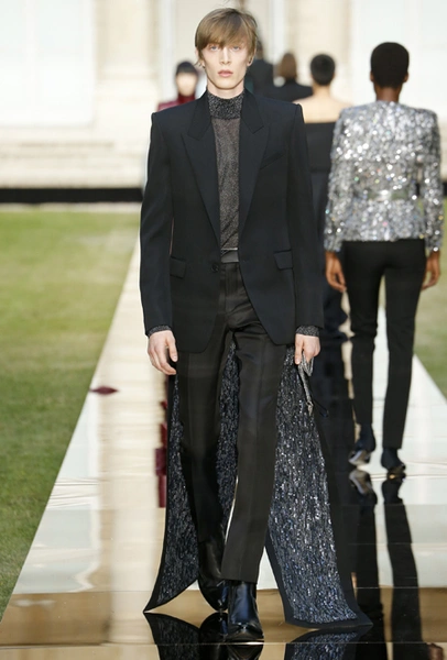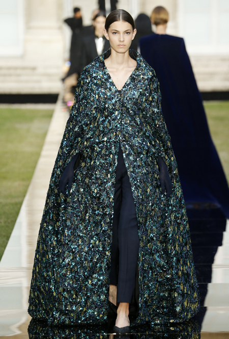 В новой коллекции вообще много «металла» и блеска, много вещей с завыенной линией плеч, будто это трибьют не сдержанным 50-м, а разнузданным 80-м. Но, разумеется, это не может не нравиться. Сверкающими пайетками расшиты похожие на русалочий хвост подолы длинных платьев, миниатюрные головные уборы (в такой же маленькой шапочке когда-то позировала фотографам муза Живанши Одри Хепберн), жакет с кейпом и даже одно пальто-унисекс прямого кроя. Блеска добавляют и длинные серьги-шандельеры, украшенные расшитой пайетками бахромой. Их, пожалуй, можно назвать главным аксессуаром коллекции.