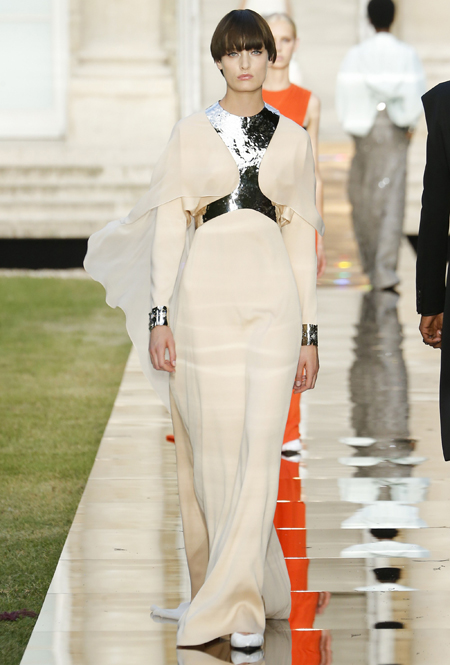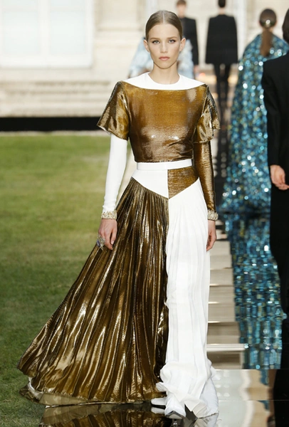 Образы, которые создала на этот раз Клэр, хоть и отсылают к ушедшей эпохе, не похожи на запылившиеся экспонаты музея моды. Это мастерски скроенные, сложносочиненные, архитектурные творения. Произведения искусства – но созданные для жизни, не для витрин или музейных полок. Взять хотя бы платья в пол с блестящими вставками из металлизированного материала. Вставки, похожие на доспехи, контрастируют со струящейся тканью. Этот прием как бы говорит нам: «Женщина Givenchy не такая беззащитная, какой может показаться на первый взгляд». Вполне современный подход, учитывая растущую популярность феминизма.