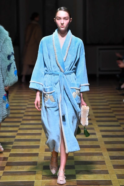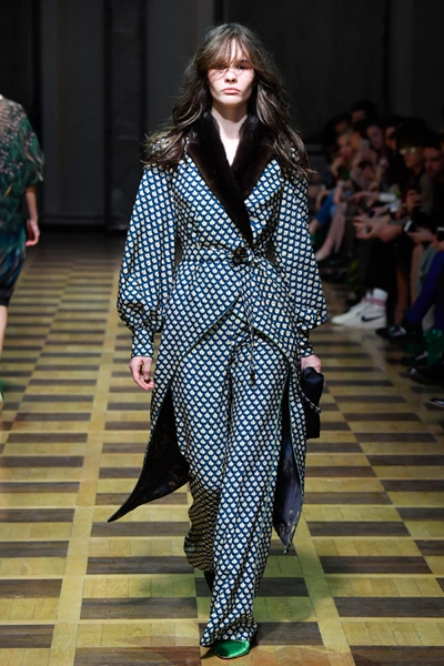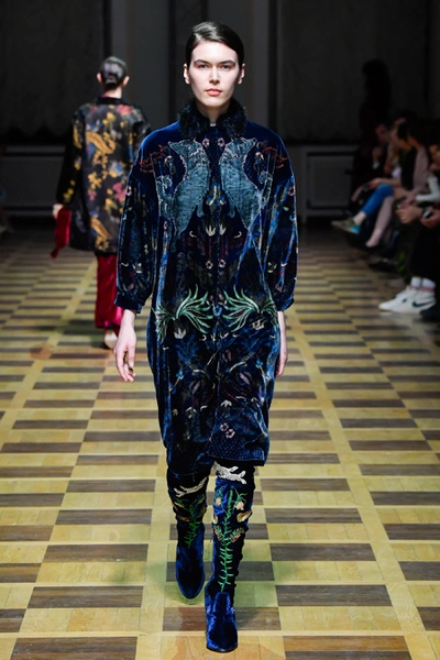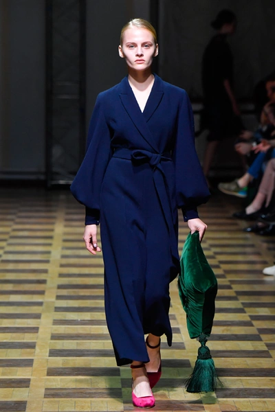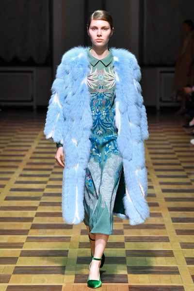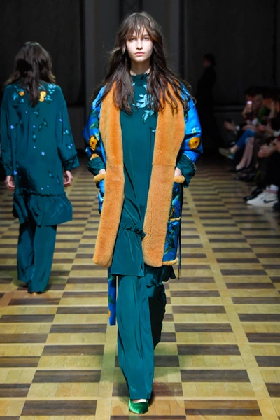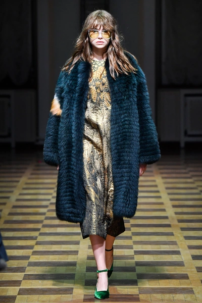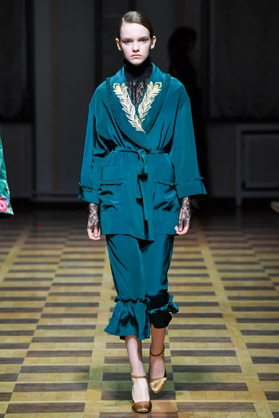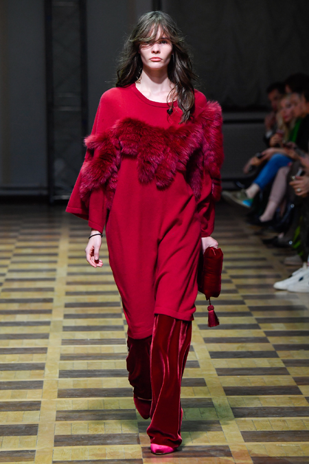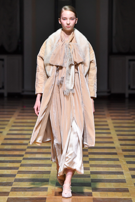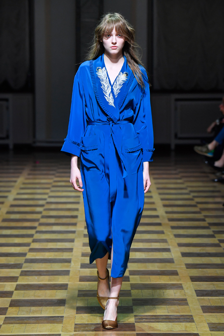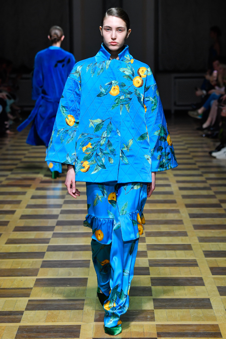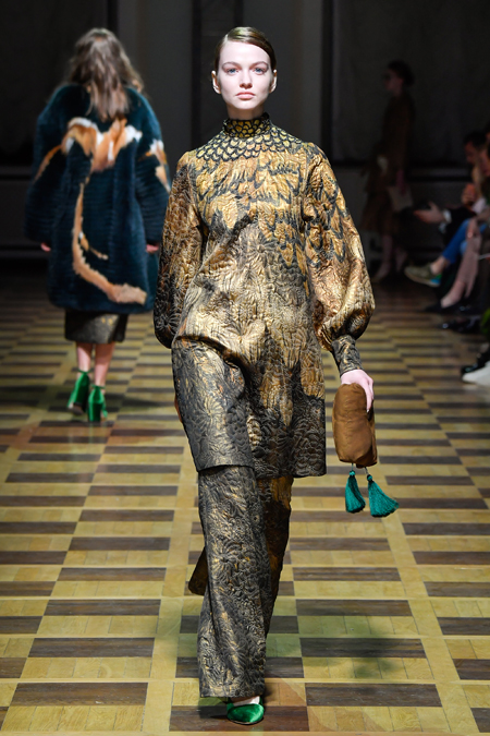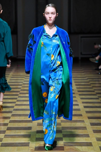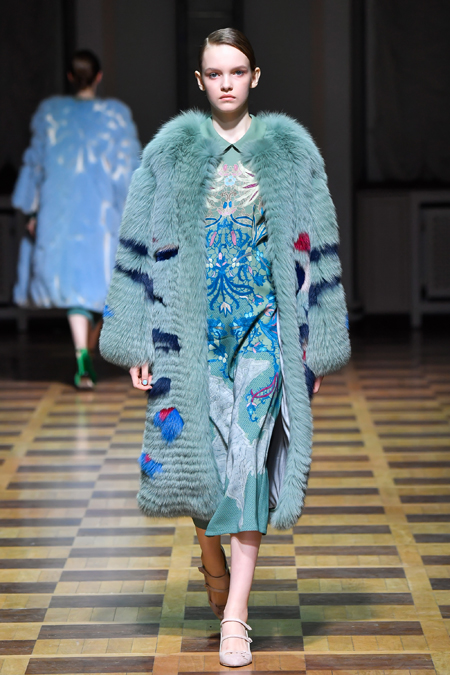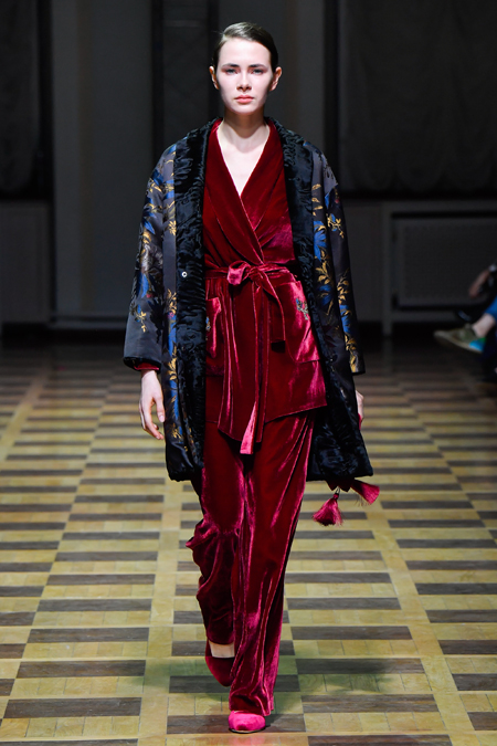 Материалы все те же: Ахмадуллина по-прежнему любит «богатые» ткани с эффектной текстурой – жаккард, бархат, шелк и натуральный мех. Причем последний часто «спрятан» в подкладке изделия. Отличный ход для дизайнера, который и так любит пышную отделку и не хочет, чтобы она казалась избыточной. Цвета для зимы необычно яркие – голубой, желтый, горчичный, ярко-красный и удивительно красивый ярко-синий.