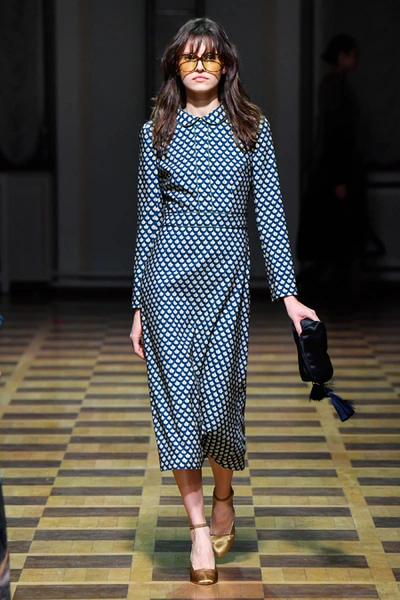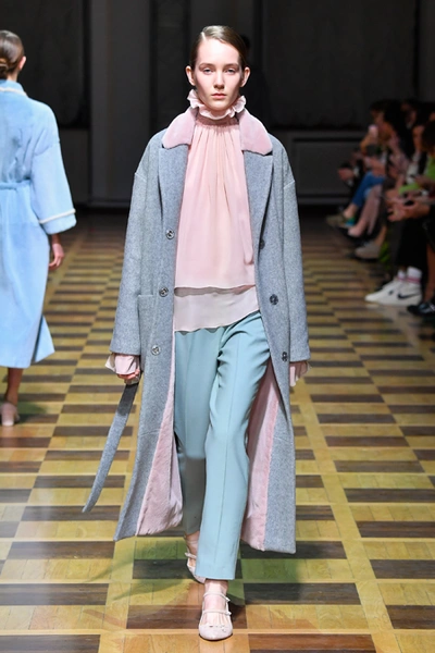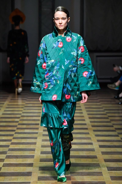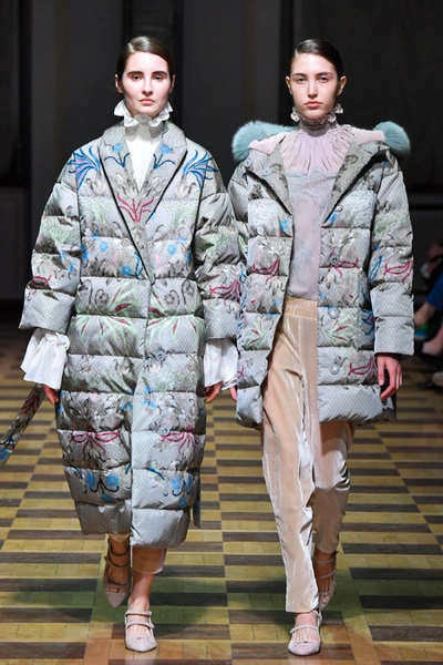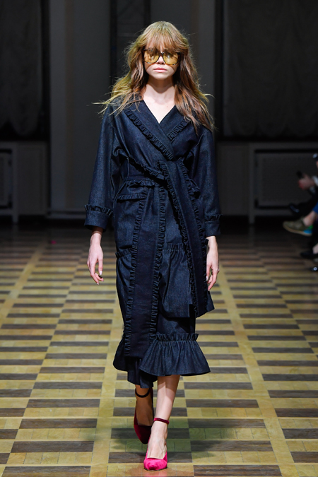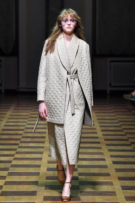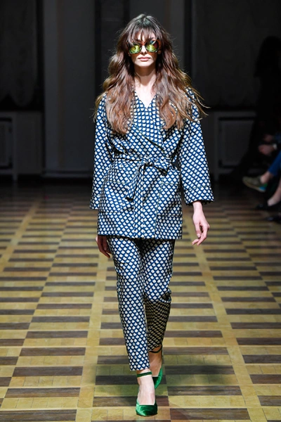 Но Ахмадуллина не была бы успешным дизайнером, если бы не пыталась каждый раз «поженить» излюбленную тему с одним из актуальных трендов. На этот раз за современность в ее коллекции отвечают 70-е (напомним, что в грядущем сезоне ими вдохновляются и многие западные гуру вроде креативных директоров Sonia Rykiel и Chloé). О них напоминает обилие стеганой ткани. Из нее, например, сшиты объемные ярко-голубые куртки-жакеты, а также длинные платья с приталенным силуэтом и пышными рукавами, банты на вороте и обилие рюшей на полупрозрачной ткани.