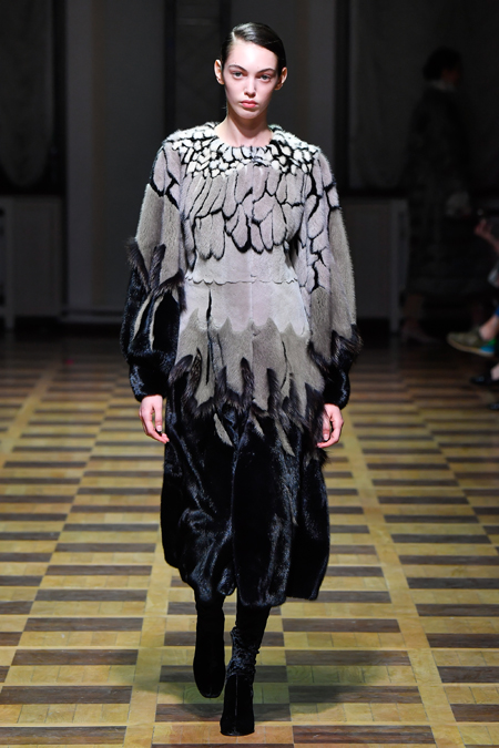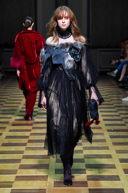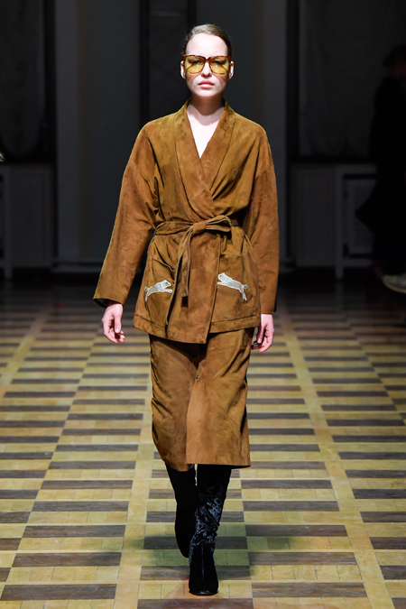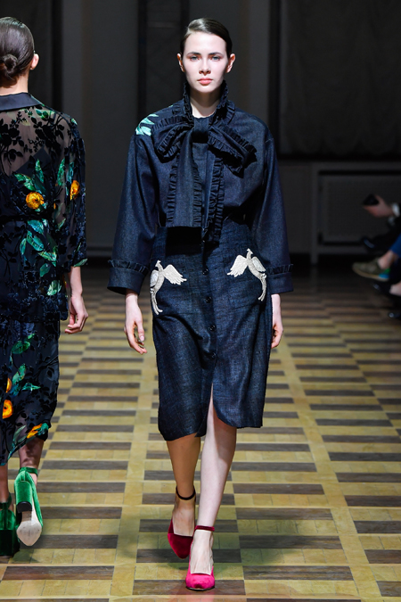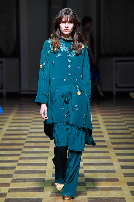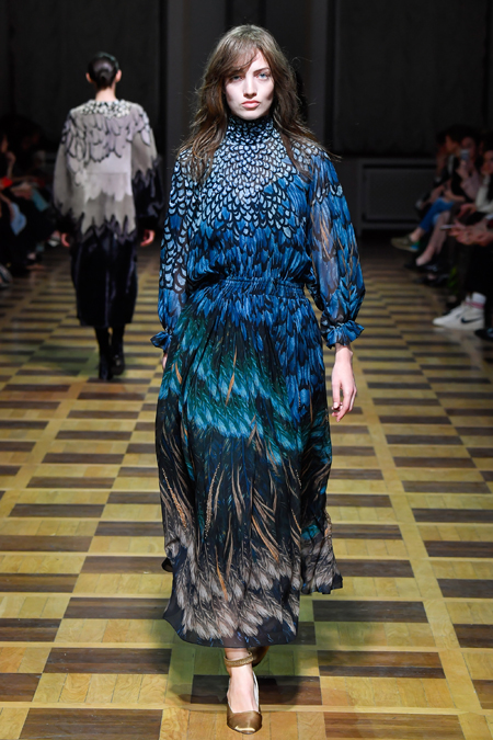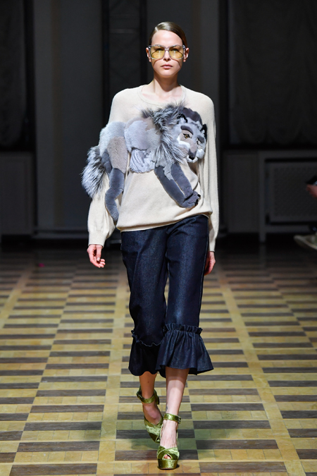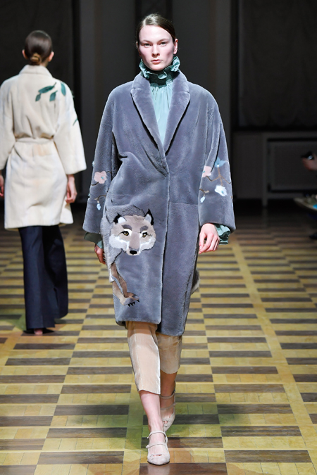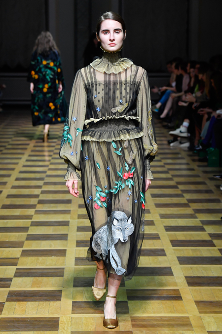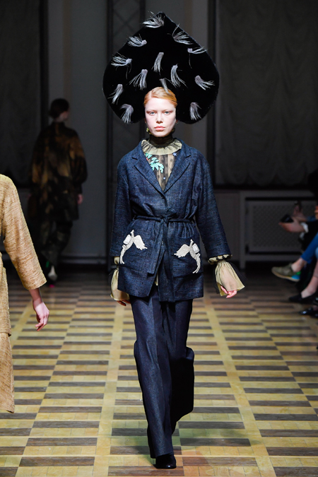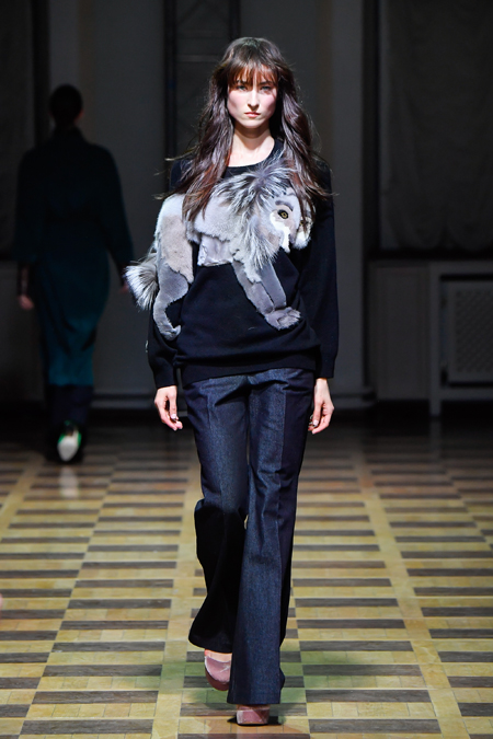 Главной темой осени-зимы стали сказки о Жар-птице и о Сером волке. Как это часто бывает у Ахмадуллиной, тема проводится через отделку, а именно – через виртуозную вышивку и эффектный принт. Чудо-птица и серый хищник кое-где вышиты на платьях и объемных свитерах «в полный рост», на других вещах принты напоминают по форме перья и птичьи крылья.