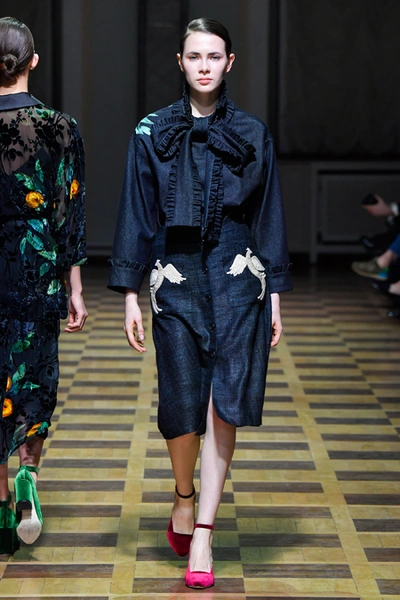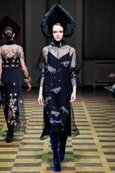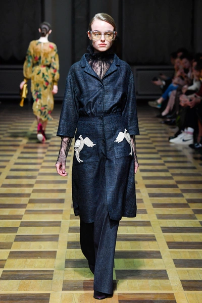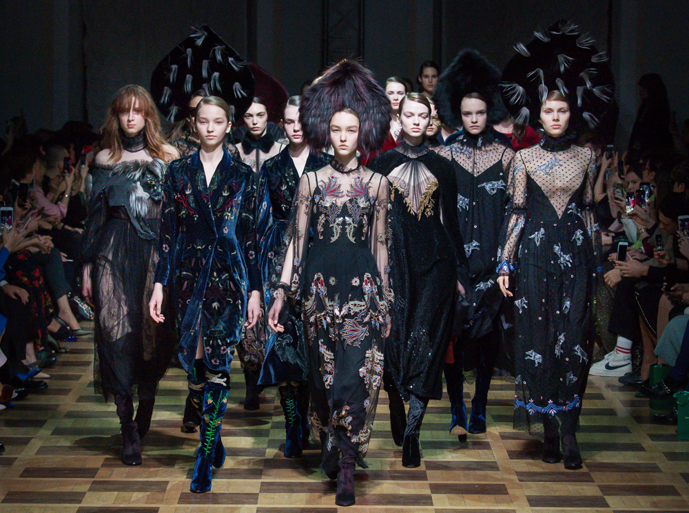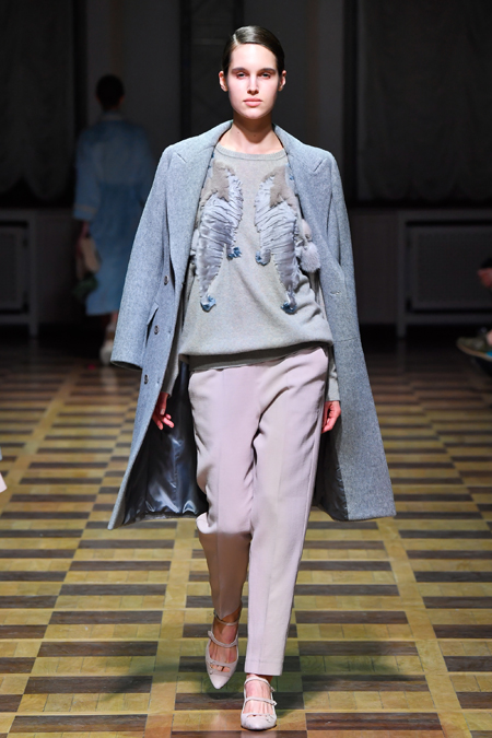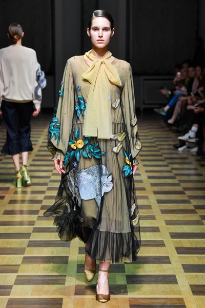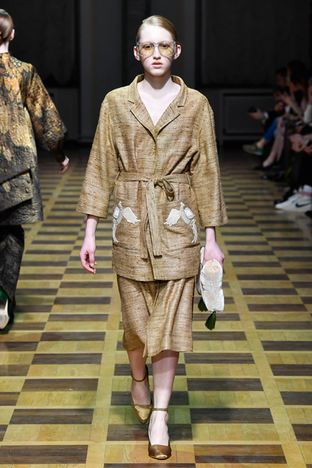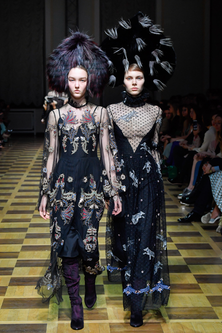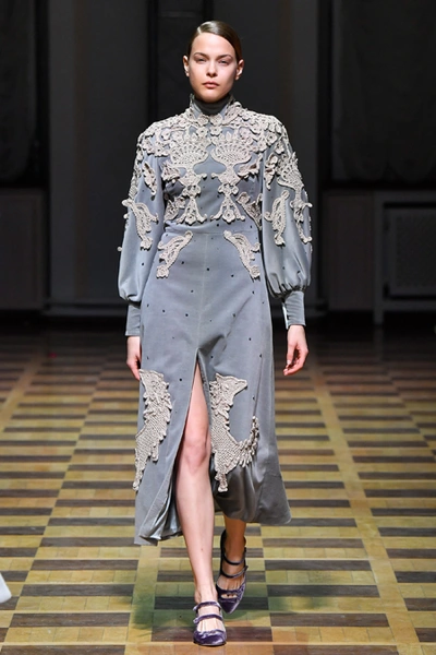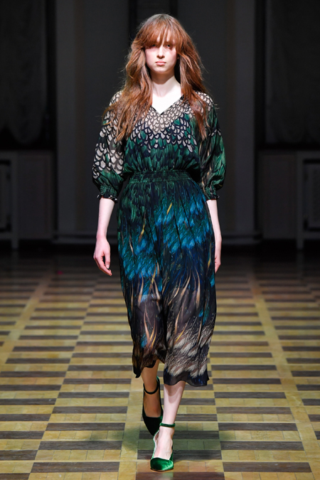 Главной темой осени-зимы стали сказки о Жар-птице и о Сером волке. Как это часто бывает у Ахмадуллиной, тема проводится через отделку, а именно – через виртуозную вышивку и эффектный принт. Чудо-птица и серый хищник кое-где вышиты на платьях и объемных свитерах «в полный рост», на других вещах принты напоминают по форме перья и птичьи крылья.