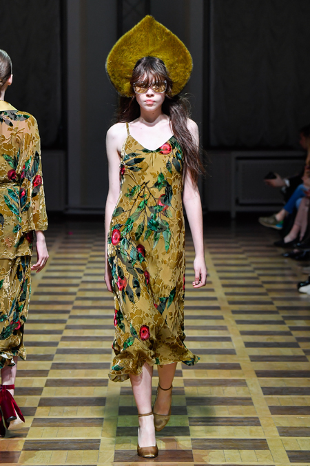 Еще один узор – «молодильные яблоки» – другой популярный архетипический образ из русских сказок. При появлении на подиуме модели в длинном золотисто-горчичном платье, на котором алели те самые крупные яблоки, за смартфонами потянулись даже те, кто с начала показа не сделал ни одного фото.