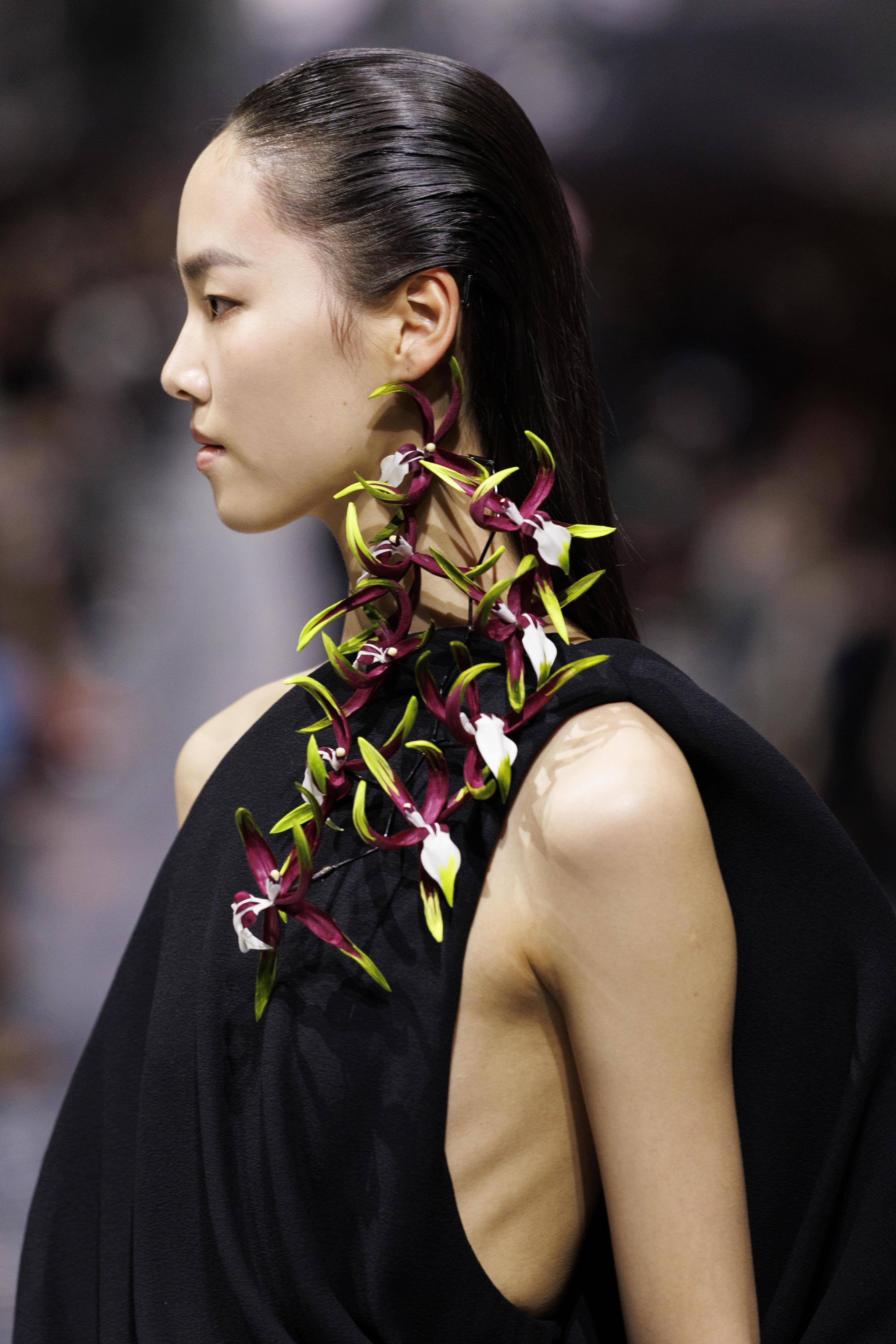 Однако главной гордостью его райского сада оказались вещи вполне рукотворные — образы, которые он создал сам. Как и ожидалось от Джонатана, коллекция вновь оказалась полна отсылок. Цикламены, гортензии и другую растительность дизайнер то и дело цитирует в силуэтах, фактурах и аксессуарах — уши моделей, например, вместо серег украсили вполне реальные представители флоры.
