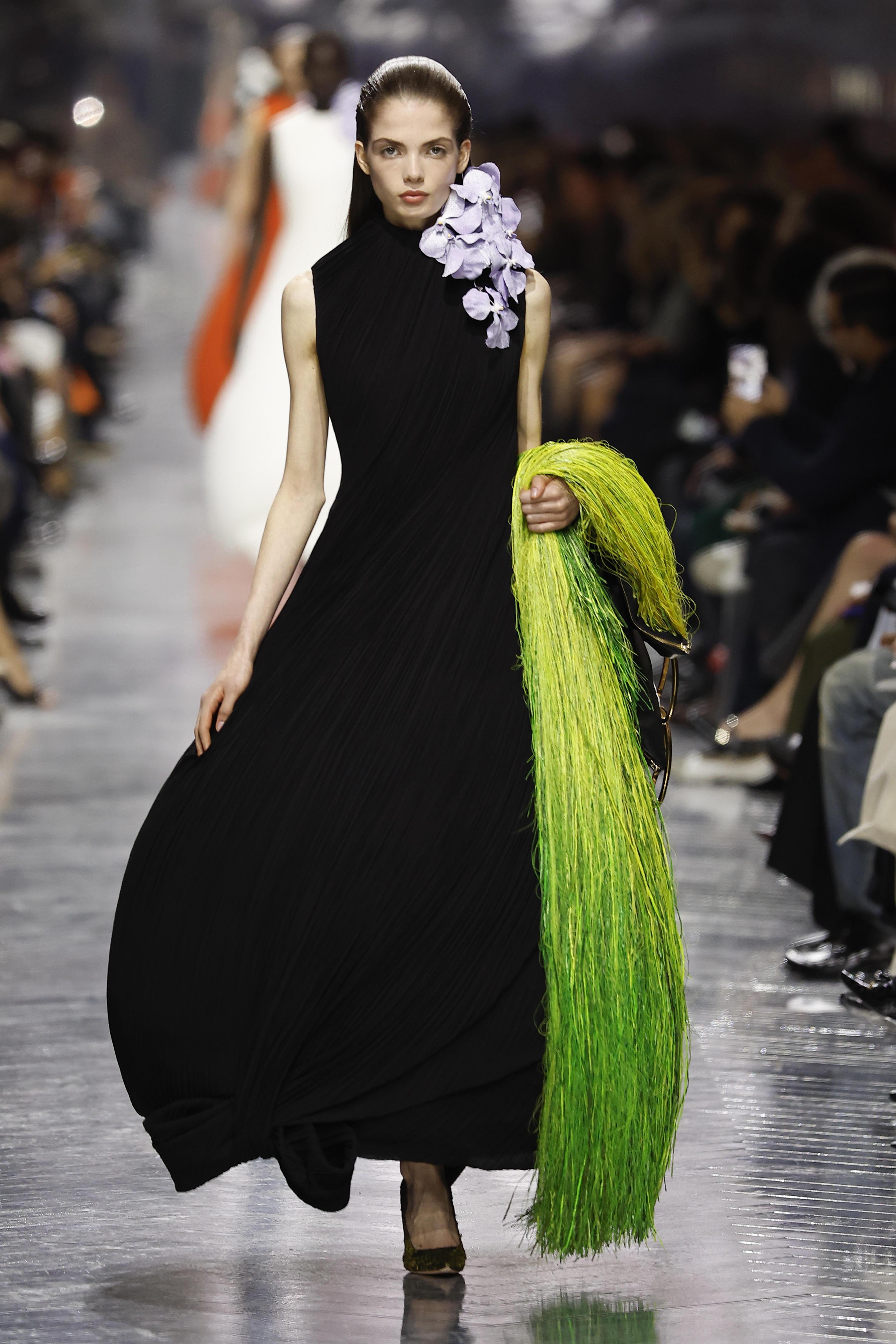 А теперь ему наследует Джонатан Андерсон. Его стараниями зал музея обернулся в масштабированный аналог флорариума, в котором, прямо над посадочными местами для гостей, возвышались розовые глицинии, а с потолков за показом наблюдали цикламены, которые дизайнер также разослал в качестве приглашения. На них выбор пал отнюдь не случайно: как вспоминает сам Андерсон, в прошлом году, перед его первым женским показом в Dior, он встретился с экс-креативным директором Дома Джоном Гальяно. Тот вручил Джонатану подарок — небольшой букет цикламен, перевязанных черной лентой.