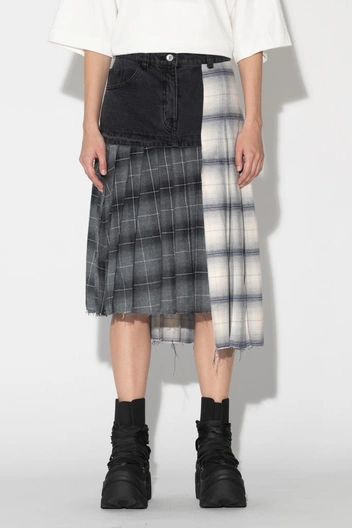 На плечи накидываем пиджак Ushatava, его отличие — дизайн-прием Dropped Shoulders для необычной формы вещи. Необычно и стильно смотрится и юбка Red September с плиссировкой ассиметричного кроям, джинсовой вставкой и двумя видами мягкой фланели.