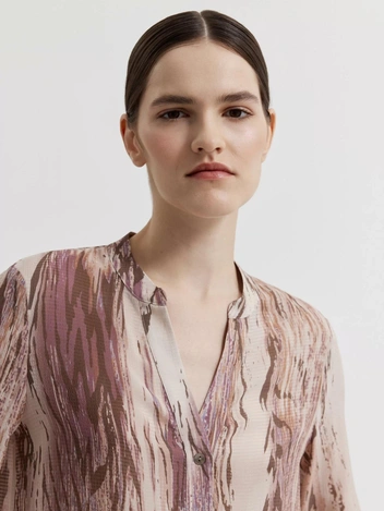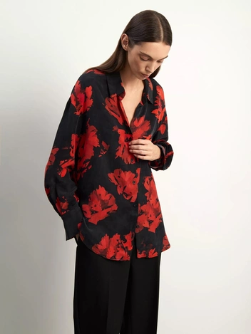 Рубашка со смелыми алыми мазками Emka станет главным украшением базового аутфита, а для более женственного силуэта выберите воздушную блузу Charuel в пастельных оттенках и стилизуйте с широкими брюками расслабленного силуэта.