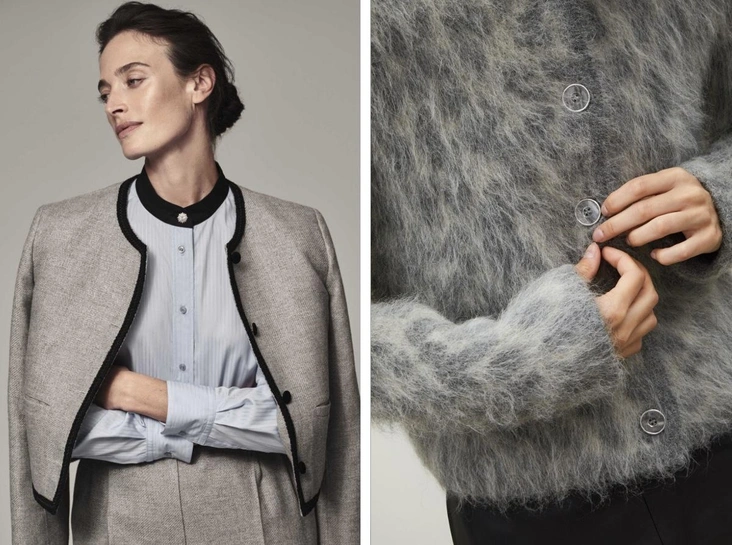 Собираем незаменимый тотал-лук вместе с брендом Mollis: брюки, жилет и жакет, все выполнено в модном сером оттенке и в комплекте выглядят стильно и элегантно. Невозможно пройти мимо и рубашки Present & Simple, сочетающей принт в жаккардовую полоску, воротник-стойку и выразительный акцент — пуговица с камнями.