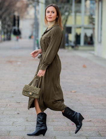 Желание носить платья можно легко реализовать даже зимой. В этом сезоне многие инфлюенсеры выбирают теплые удлиненные платья на пуговицах. Причем такие модели отлично подойдут не только для офиса, поэтому ваш гардероб будет максимально вариативен. А сочетать их можно как с полуботинками, так и с высокими сапогами.