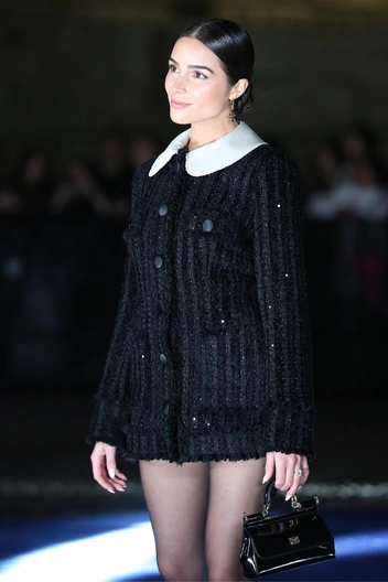 В образе модели явно был намек на стиль «преппи» — вязаная ткань, похожая на твид, а также аккуратный белый воротник. Калпо дополнила образ аккуратным пучком, серьгами с черными крестами и лакированной черной сумкой узнаваемой модели Sicily, конечно, от Dolce&Gabbana.