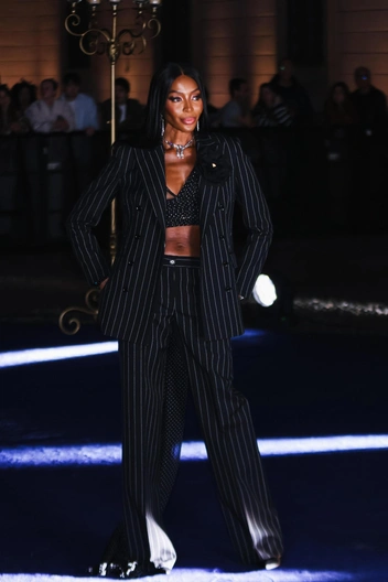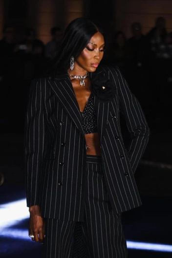 «Черная пантера» мировых подиумов выбрала вещь «вне времени» — идеально скроенный черный костюм в вертикальную полоску. Любая статья о моде будет твердить, что разные принты в одном образе лучше не сочетать — но Наоми доказывает, что у любого правила есть исключения. Не зря из-под ее пиджака в полоску виднеется черный топ в белый горошек с длинным шлейфом сзади. Модель дополнила образ черным клатчем из шелка и лодочками на высоком каблуке из той же ткани, разрушив еще одно правило — не сочетать обувь и сумку (про которое тоже пора забыть).