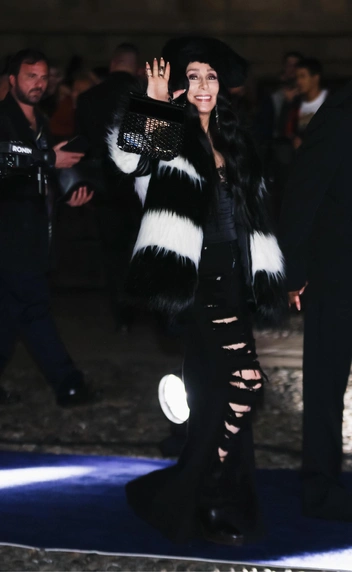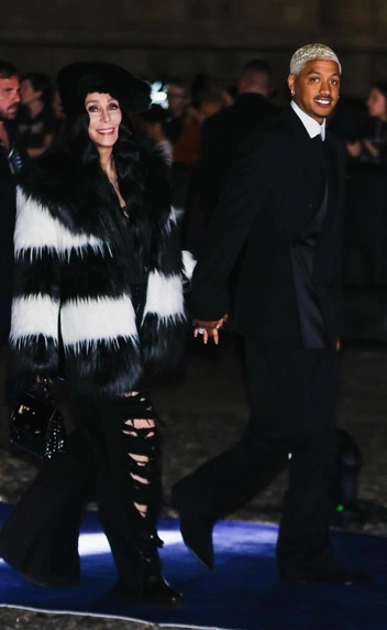 Певица появилась в неожиданном луке с черными рваными джинсами и объемной шубой в полоску — которая, конечно, стала главной «звездой» вечера. Образ дополнила лакированная черная сумка и грубые ботинки на широком каблуке. Не меньше запомнился и выход молодого спутника Шер — репера и продюсера Александра Эдвардса. Он выбрал черный костюм с брюками клеш и атласными вставками, который сочетал с белой сорочкой.