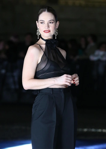 Британская актриса показала мастер-класс, как выглядеть просто и шикарно в одно и то же время. Верх наряда был из полупрозрачной ткани с шелковым лифом (чем-то напоминающим наряд Роузи Хантингтон-Уайтли), а низ составили прямые широкие брюки из плотной черной ткани. В киноиндустрии и в моде давно сложился образ «настоящей» итальянской красавицы, которая редко надевает что-то, кроме черного, и просыпается с ярко-алыми губами (Малена Моники Белуччи — тому пример). Лили решила не нарушать традиций, и дополнила монохромный лук красной помадой, алым маникюром и аккуратным пучком, который сделал образ еще более элегантным.