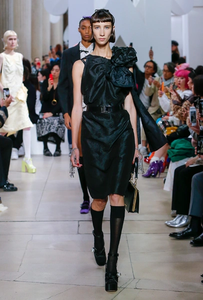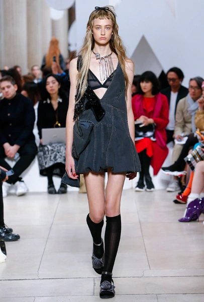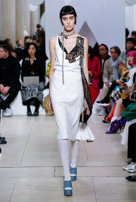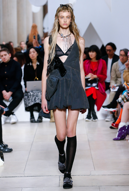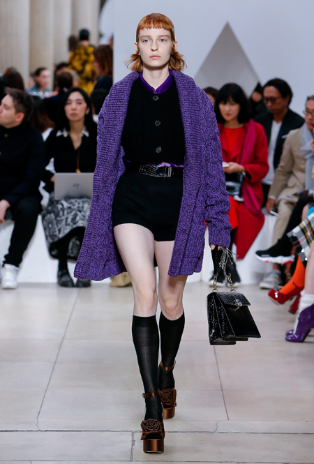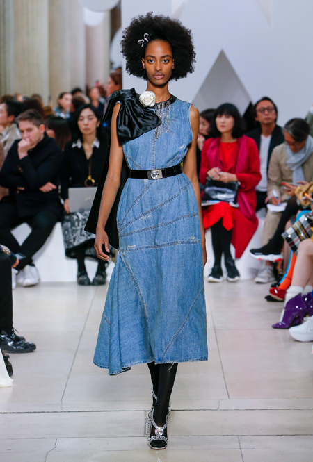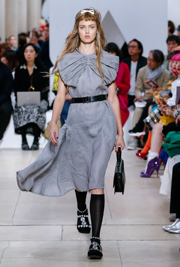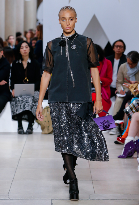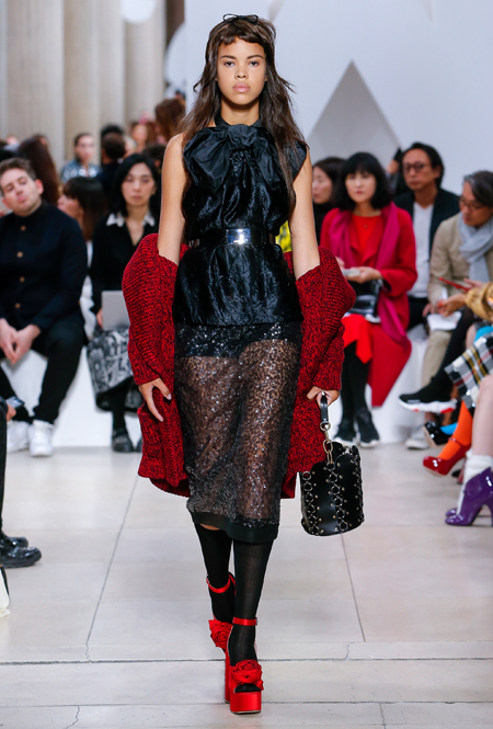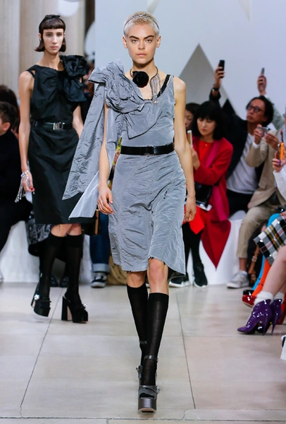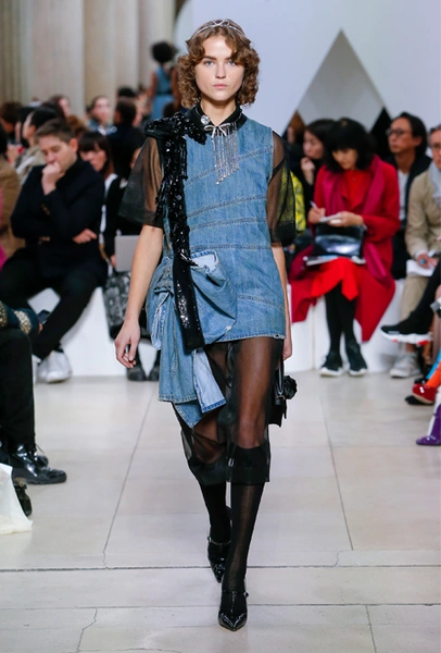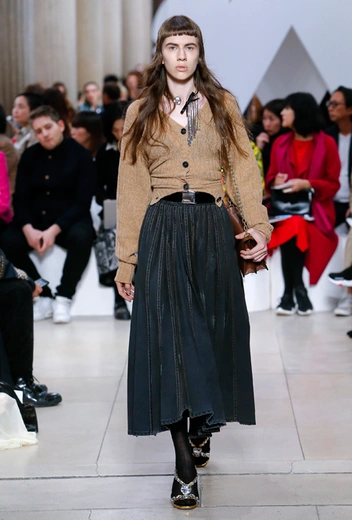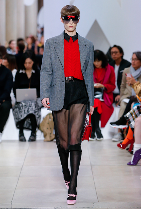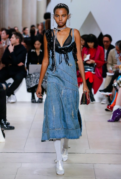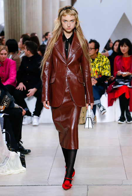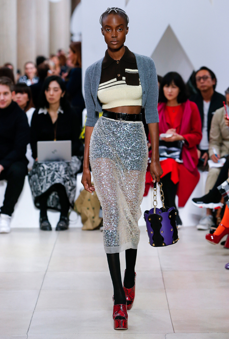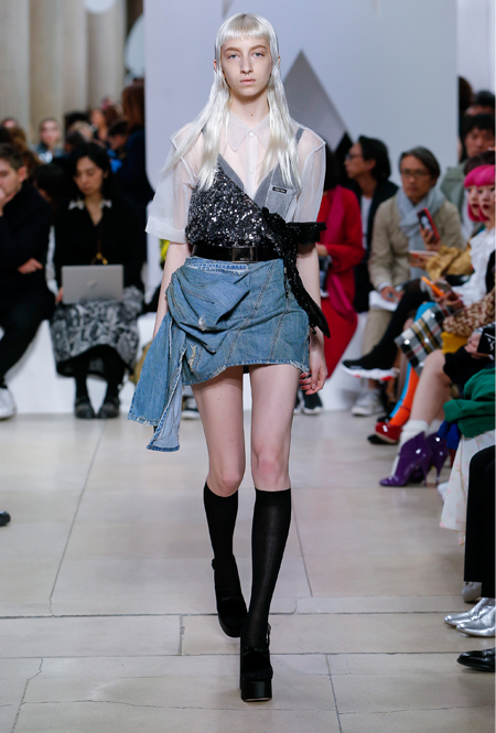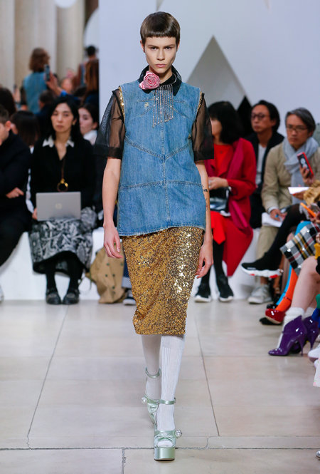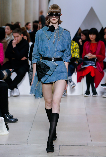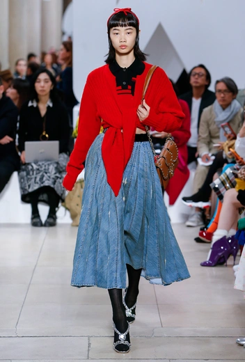 Основу для шоу Миуччи Прада составляет винтажная одежда: на эту канву дизайнер нанизывает ультрамодные тенденции, показывая, как крепко на самом деле связаны история моды и урбанистические ценности. Любовь к коже и дениму на подиум пришли прямиком из 80-х и 90-х. Ко второму в новом сезоне у дизайнеров особое трепетное отношение: Миучча представила платья из потертого денима, изрезанное диагональными швами, юбки-миди А-силуэта, объемные жилеты и сарафаны, комбинируя их с черным и белым — уже знакомое нам сочетание, которое в следующем году обретет вторую жизнь.