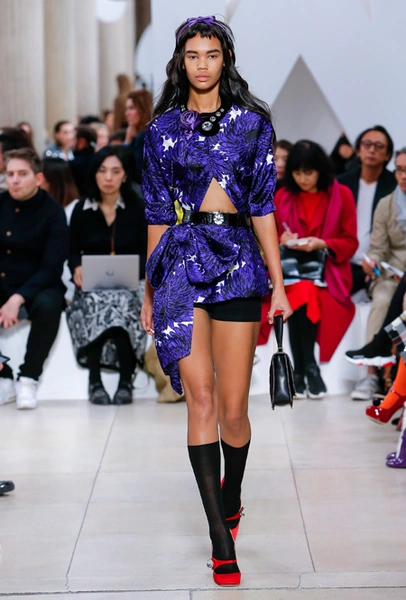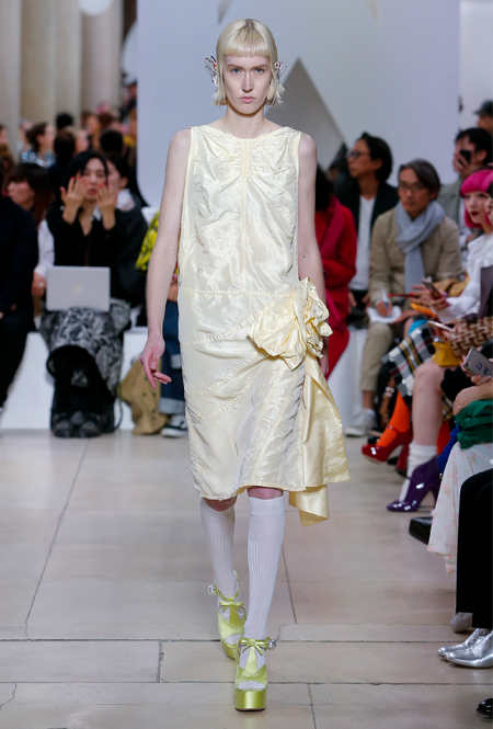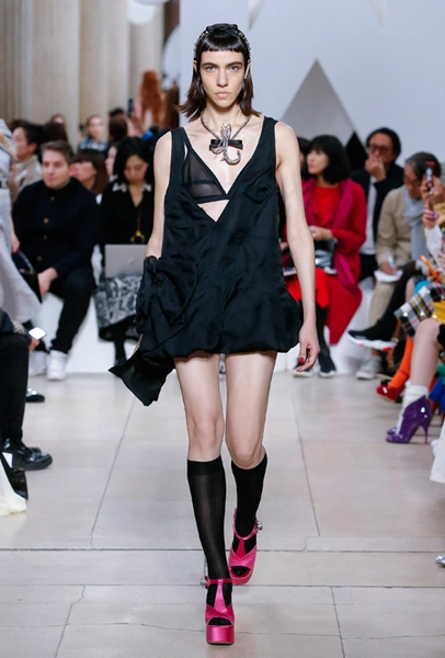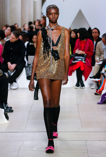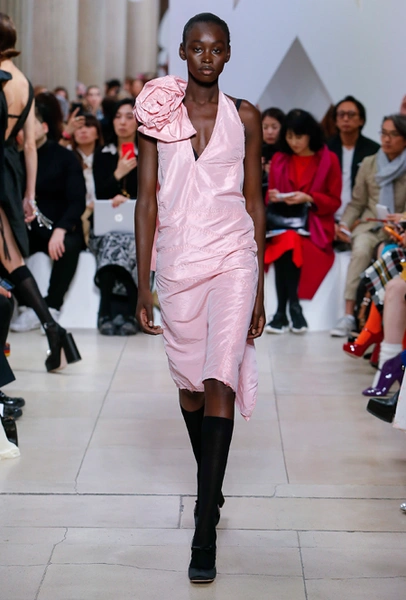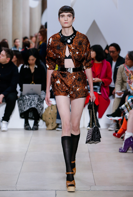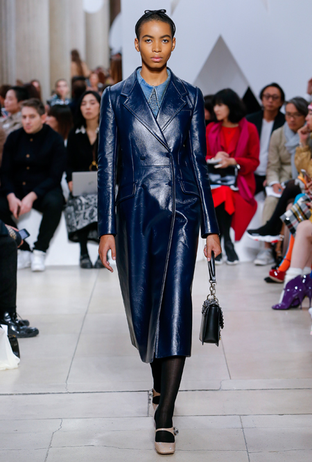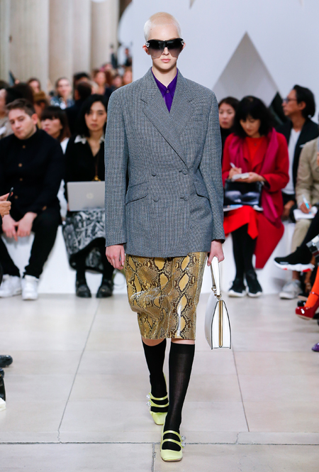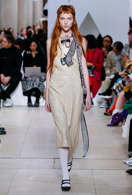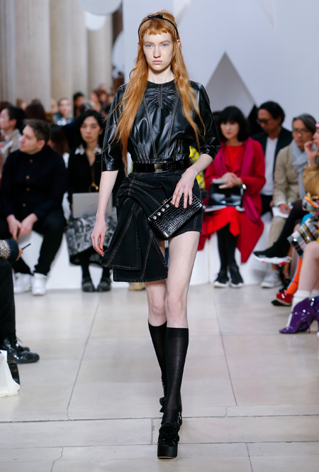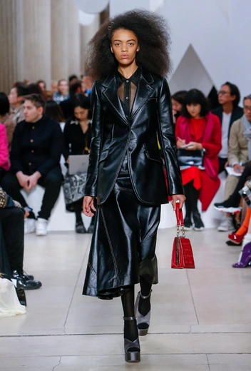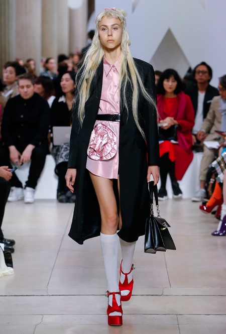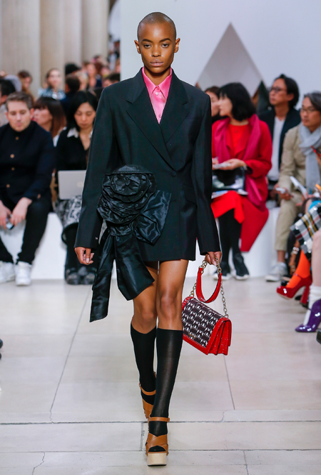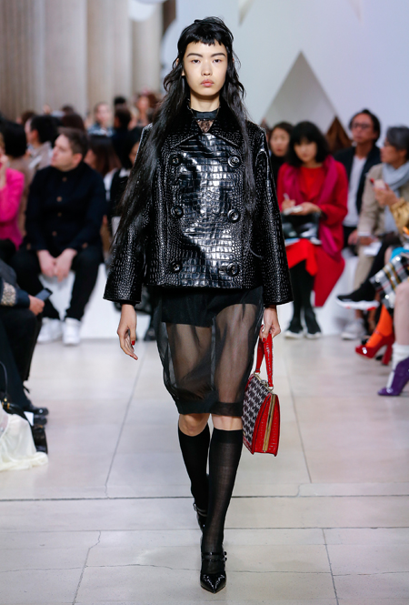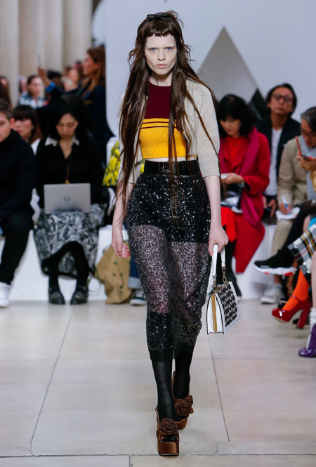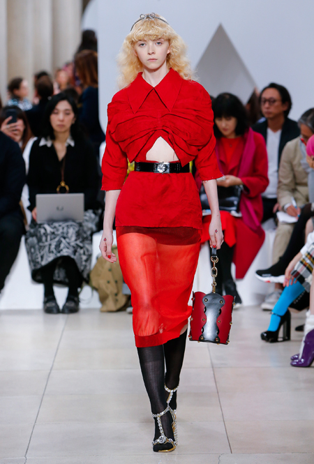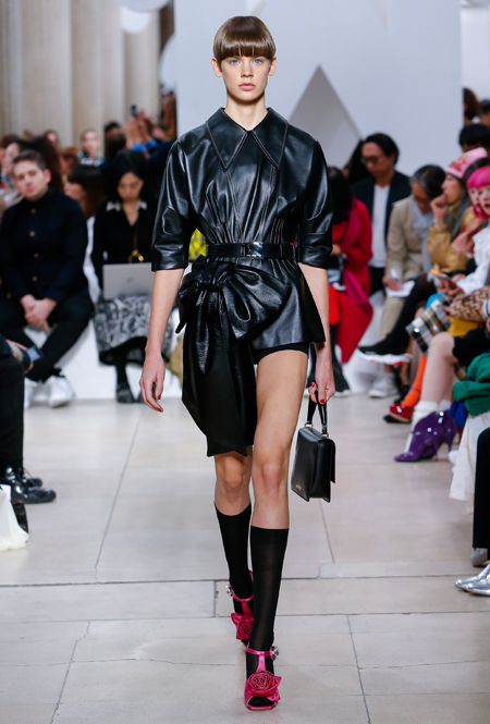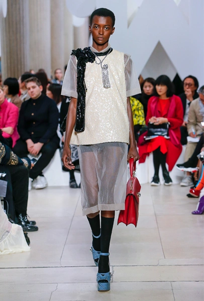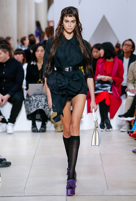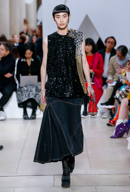 Основу для шоу Миуччи Прада составляет винтажная одежда: на эту канву дизайнер нанизывает ультрамодные тенденции, показывая, как крепко на самом деле связаны история моды и урбанистические ценности. Любовь к коже и дениму на подиум пришли прямиком из 80-х и 90-х. Ко второму в новом сезоне у дизайнеров особое трепетное отношение: Миучча представила платья из потертого денима, изрезанное диагональными швами, юбки-миди А-силуэта, объемные жилеты и сарафаны, комбинируя их с черным и белым — уже знакомое нам сочетание, которое в следующем году обретет вторую жизнь.