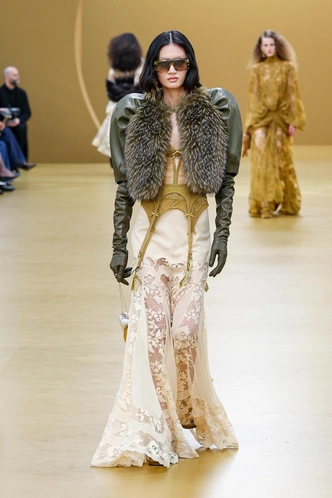 Если Милан осторожно примерял заниженную линию, то Париж жестко зафиксировал тренд: low-талия перестала быть флиртом с Y2K и стала частью взрослой, немного мрачной сексуальности. У McQueen это переосмысление тех самых легендарных Bumsters: юбки и брюки опускаются ниже привычного, но за счет жесткого кроя и корсетного верха выглядят почти театрально — как современная готика для мегаполиса. Tom Ford идет по более жесткому пути: пластиковые юбки, кожа, прозрачные слои и острые жакеты делают низкую линию талии еще более extra.