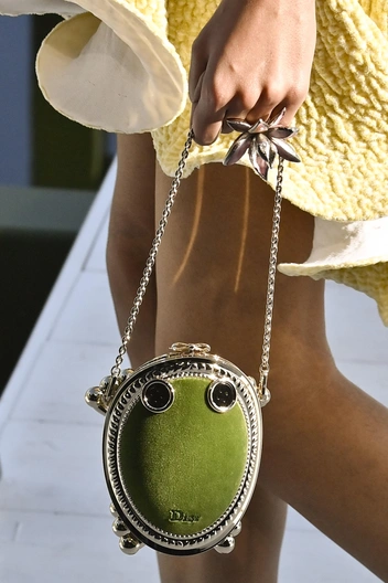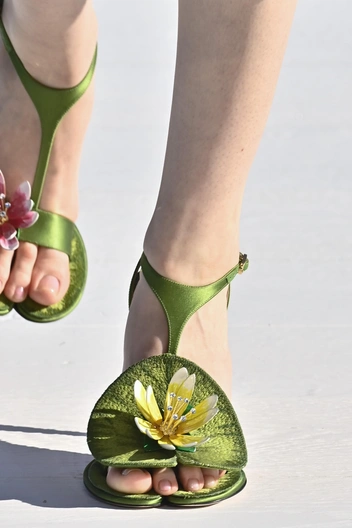 Продолжая тему флоры и фауны, Париж фиксирует еще одну одержимость сезона — взрыв цветочных мотивов и всех оттенков зелени: от лесного мха до утренней росы на траве у дома. Джонатан Андерсон буквально устраивает для Dior бал в саду: на фоне прудов и подсвеченных деревьев по подиуму ходят лягушки‑сумки, кувшинки-туфли и платья, которые выглядят как ожившие иллюстрации из ботанического атласа.