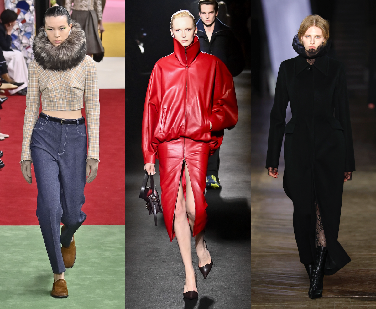 На подиуме модели буквально прячутся в этих коконах, но для реальной жизни достаточно выбирать версии, которые можно расстегнуть или отвернуть, чтобы не ощущать себя в викторианском шейном корсете.
