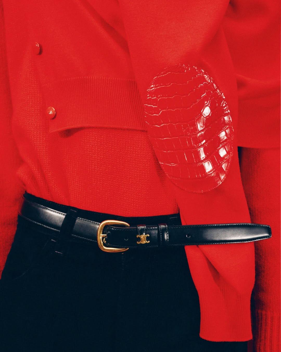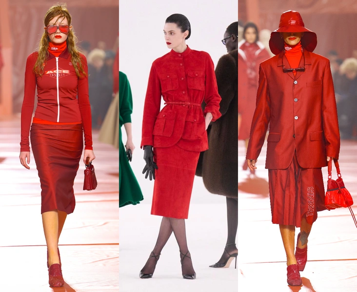 Celine играют аккуратнее: добавляют томатный в виде одного свитера, плаща или полосы на брюках, что идеально подходит для тех, кто пока не готов «гореть» полностью, но хочет добавить в свою палитру немного жизни.