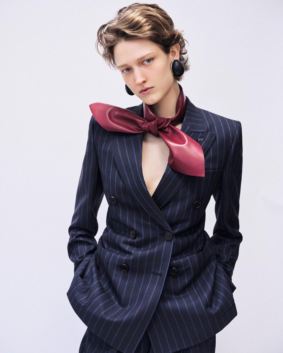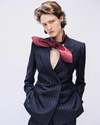 Givenchy предлагают более практичный путь — узкие шейные платки, завязанные один‑два раза вокруг шеи, которые легко вписать и в офисный дресс-код, и в аутфит на каждый день, не чувствуя себя героиней оперной постановки.