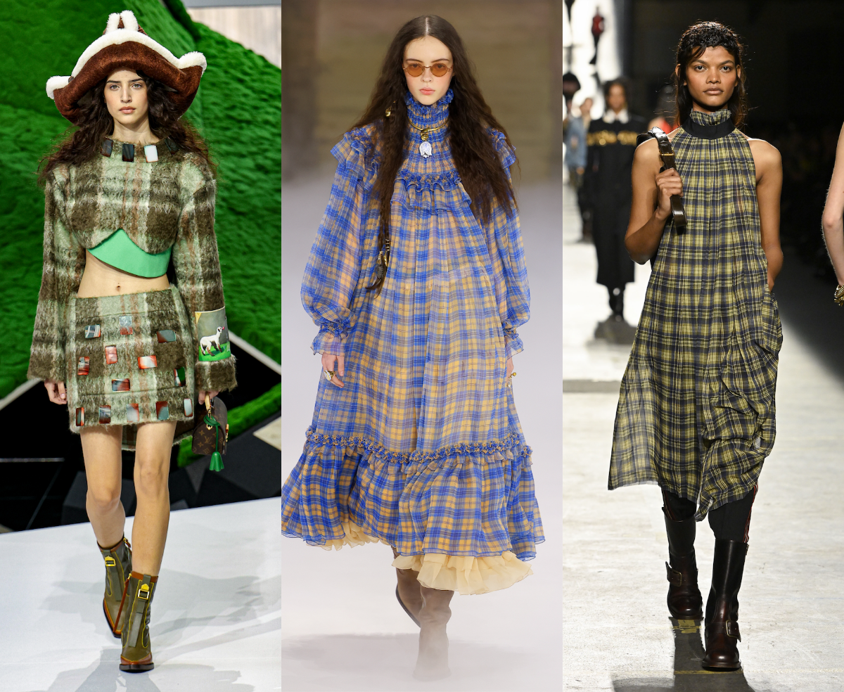 Клетка в Париже — не про домашку и дневник, а про легкий бунт и ностальгию по 90‑м, когда тартановая юбка ассоциировалась скорее с героинями рок‑клипов, чем с учительским кабинетом. Louis Vuitton, Chloé, Dries Van Noten и Ganni предлагают небесно‑голубые костюмы, хаки и цветные пальто, которые так и хочется стилизовать с грубыми ботинками, объемными свитерами и слегка растрепанными волосами.