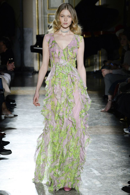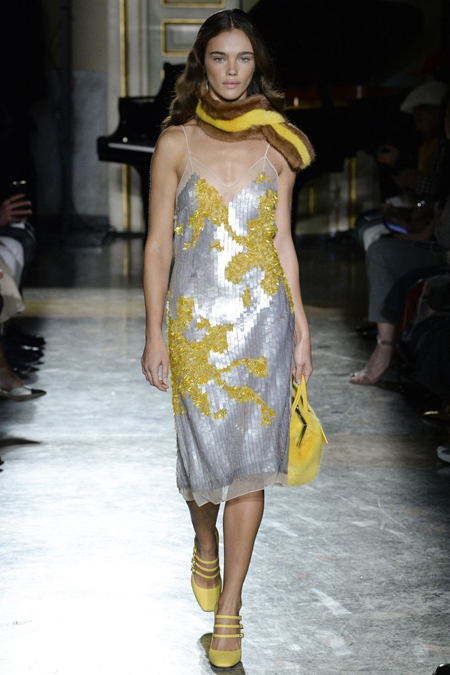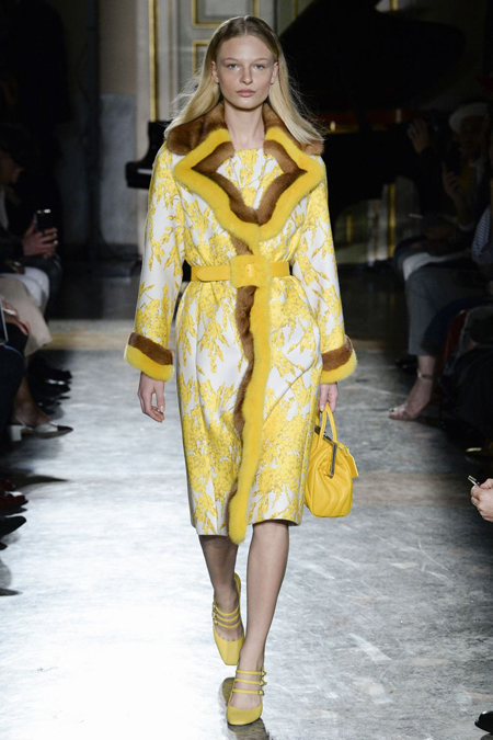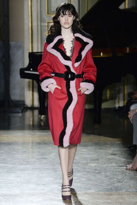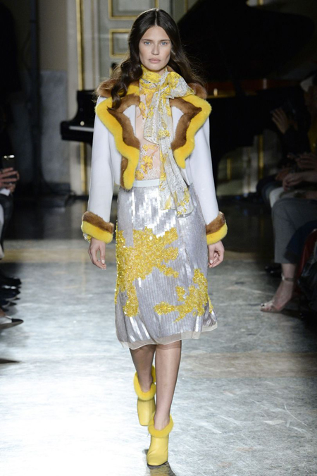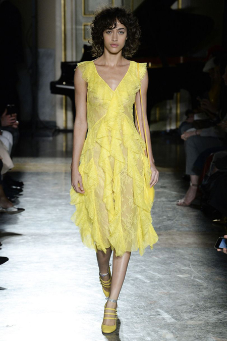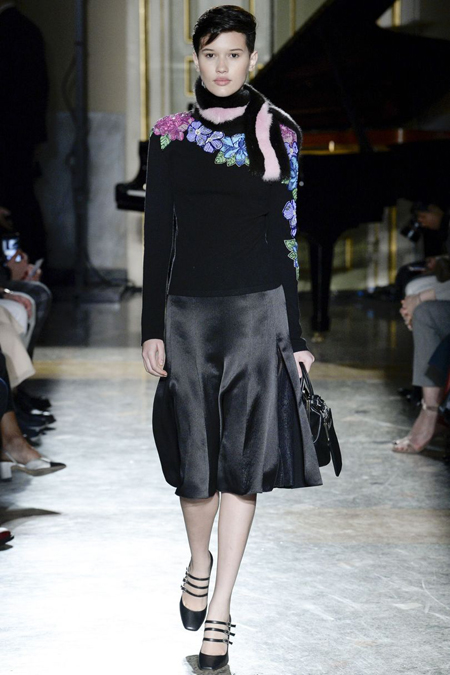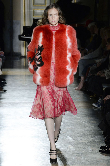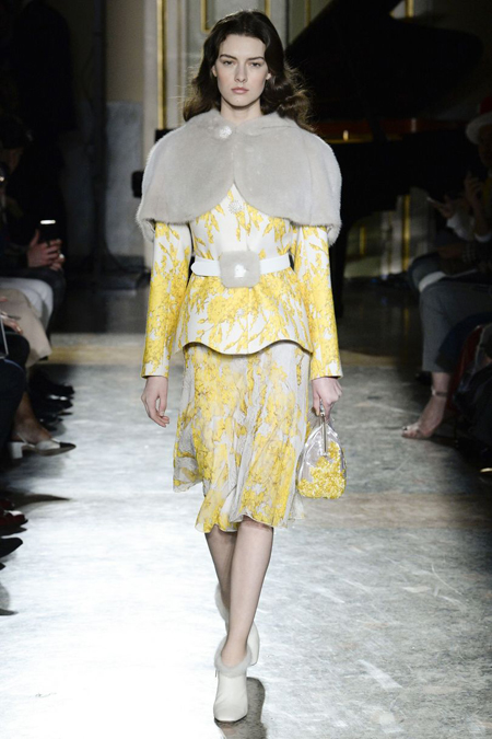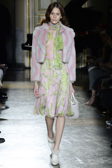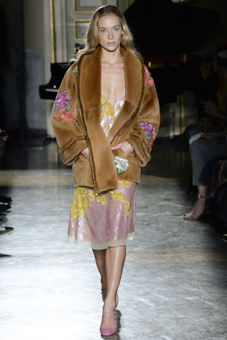 Нежные цвета – такие оттенки западные критики метко прозвали цветами gelato – вызывают в памяти картины импрессионистов и солнечные полотна мастеров Возрождения. Лимонно-желтый здесь плавно перетекает в золотой, а пастельно-розовый сливается с нежно-сиреневым. Не обошлось и без красного – цвета багряного заката и полупрозрачные невесомые коктейльные платья и эффектные наряды в пол и объемные меховые жакеты и плащи. Даже черный выглядит празднично – все потому что черные наряды украшены разноцветной цветочной вышивкой. Причем, Молинари не боится сочетать в одном образе отделку приглушенных тонов и «спорящие» с ней неоново-яркие узоры.