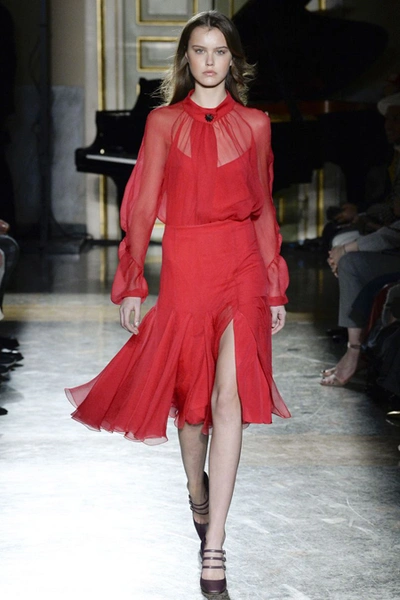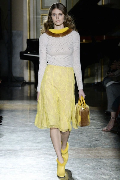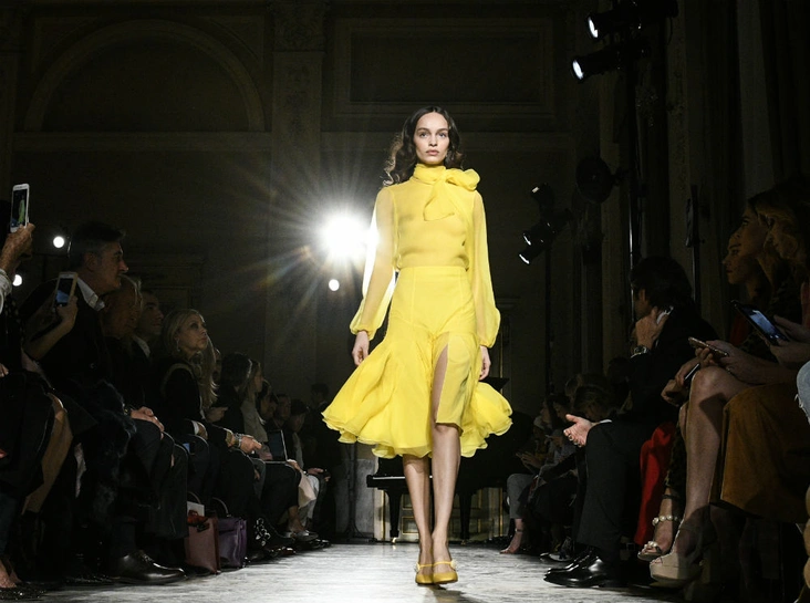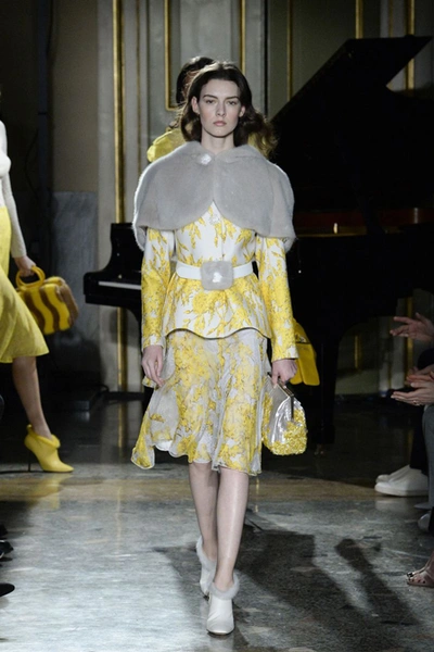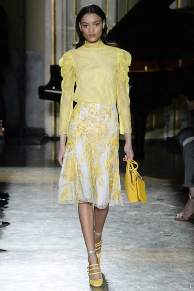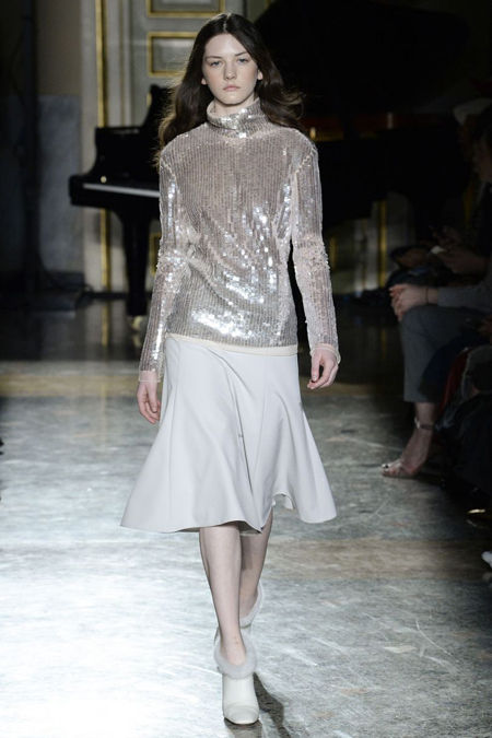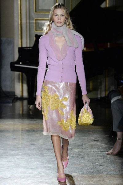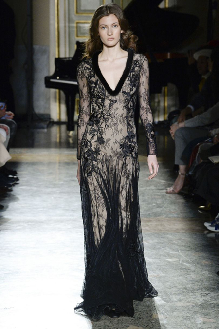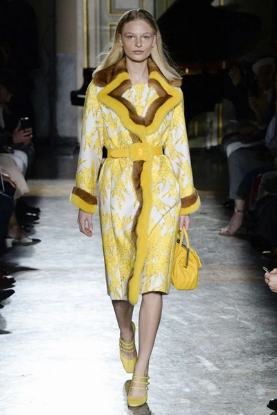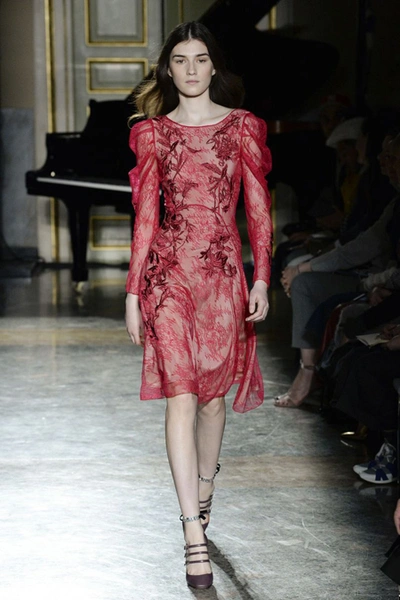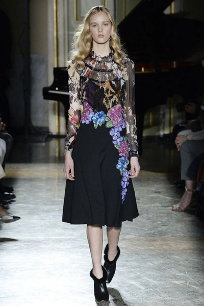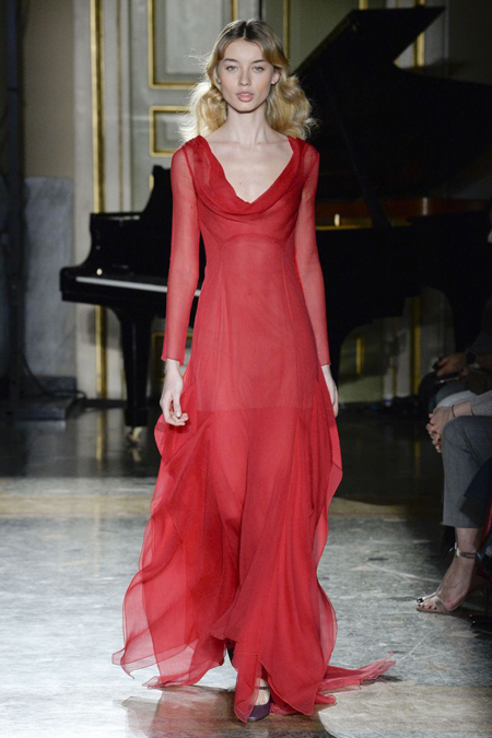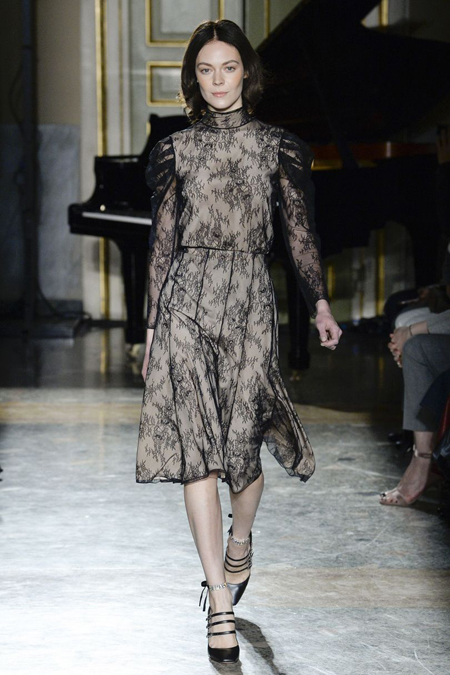 Нежные цвета – такие оттенки западные критики метко прозвали цветами gelato – вызывают в памяти картины импрессионистов и солнечные полотна мастеров Возрождения. Лимонно-желтый здесь плавно перетекает в золотой, а пастельно-розовый сливается с нежно-сиреневым. Не обошлось и без красного – цвета багряного заката и полупрозрачные невесомые коктейльные платья и эффектные наряды в пол и объемные меховые жакеты и плащи. Даже черный выглядит празднично – все потому что черные наряды украшены разноцветной цветочной вышивкой. Причем, Молинари не боится сочетать в одном образе отделку приглушенных тонов и «спорящие» с ней неоново-яркие узоры.