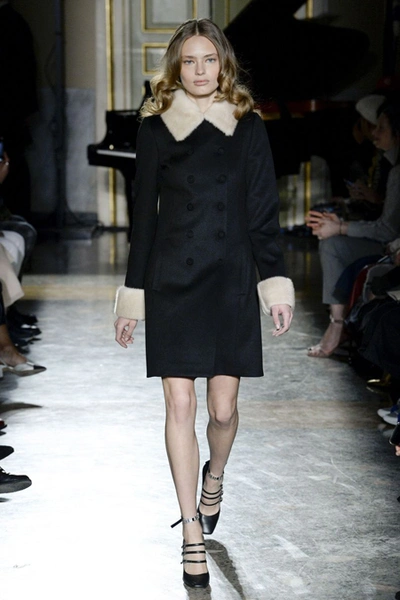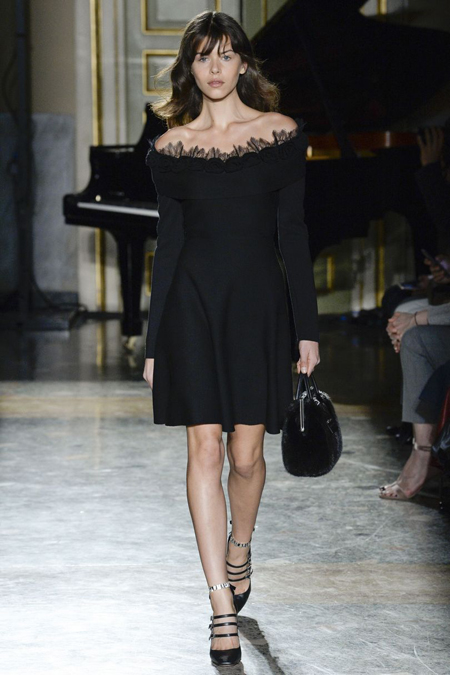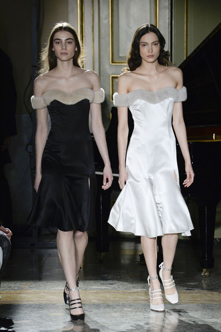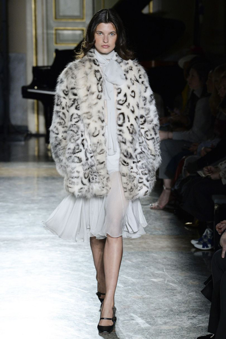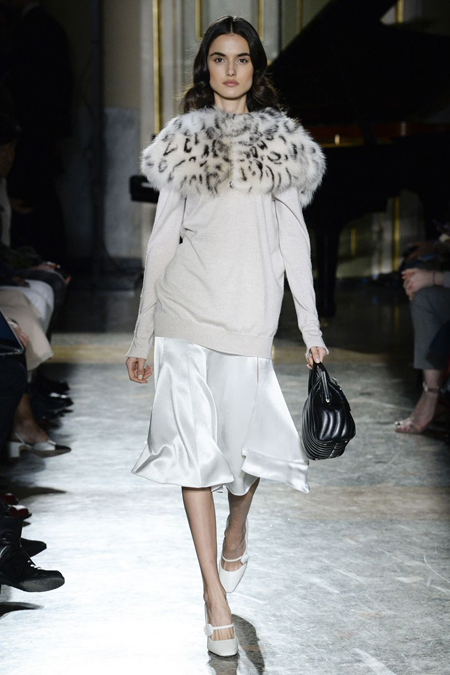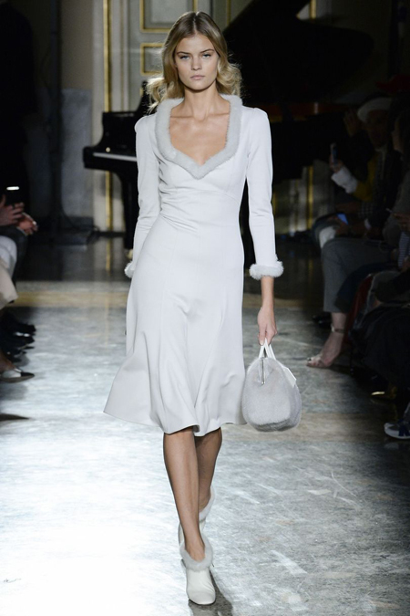 Очень празднично выглядят крупные отложные воротники жакетов и кардиганов – пышная контрастная оторочка превращает их из сугубо функциональной детали едва ли не в центральный элемент образа. Оторочка – самая необычная деталь показ - есть даже на коктейльных платьях декольте, где она позволяет подчеркнуть линию груди.