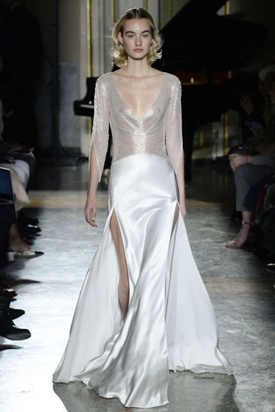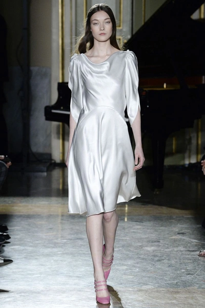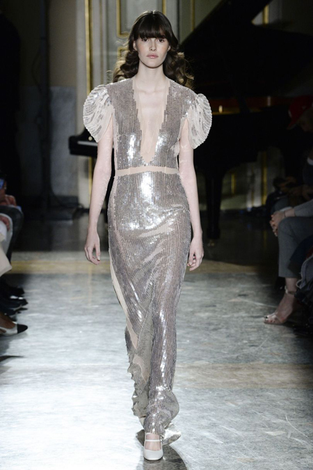Не менее торжественны наряды, при создании которых упор был сделан не на цвет или отделку, а – на крой. Скроенные по косой платья из серебристого шелка и струящейся блестящей ткани облегают тело, словно вторая кожа, а выглядят как настоящее произведение портновского искусства.