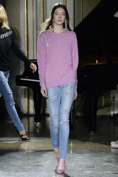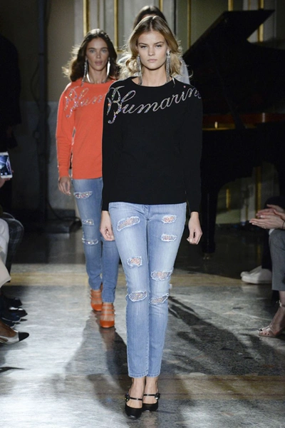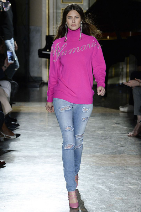 Завершили показ неожиданно гранжевые по духу выходы моделей в рваных джинсах и разноцветных свитшотах и водолазках с блестящей надписью Blumarine. Их, как часть капсульной юбилейной серии, можно уже сейчас купить на официальном сайте бренда.