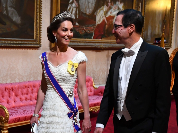 На банкете в честь государственного визита президента Трампа в Великобританию герцогиня Кембриджская вновь положилась на свою любимую диадему. Она дополнила тиару «Узелки любви» сапфировыми и бриллиантовыми серьгами Королевы-матери и своим новым Королевским Викторианским Орденом.