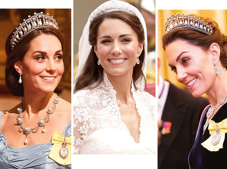 Тиара, которую носит Кейт, была создана для королевы Марии в 1913 или 1914 году Домом Garrard из жемчуга и бриллиантов, уже принадлежащих ее семье. Она смоделировала его по образцу тиару своей бабушки принцессы Августы Гессен-Кассельской — оригинальной Кембриджской тиары «Узелки любви», которая в настоящее время находится в неизвестной частной коллекции (читайте также: Секреты придворных ювелиров: кто и как создает украшения для Королевы и ее семьи).