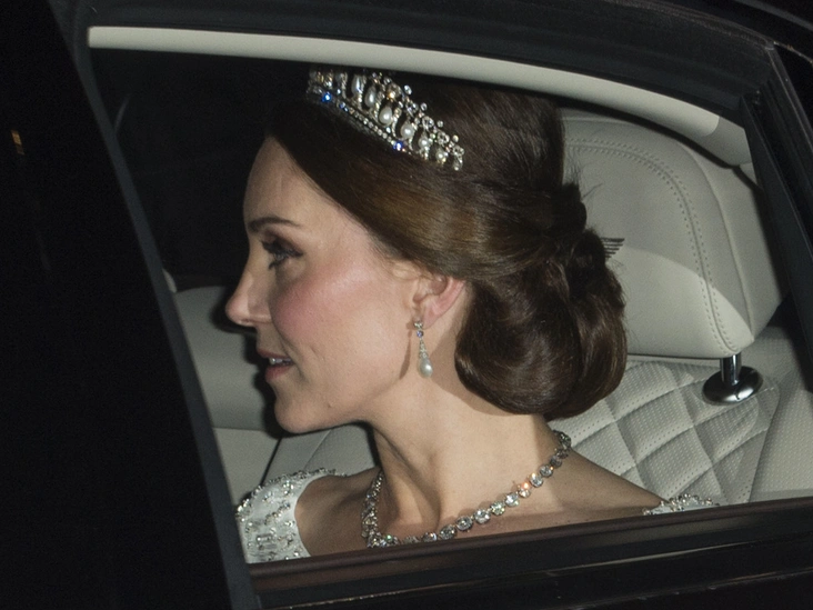 Кейт снова выбрала тиару «Узелки любви» для ежегодного дипломатического приема в Букингемском дворце в 2017 году. В тот вечер она дополнила ее бриллиантовым ожерельем и серьгами с бриллиантами и жемчугом.