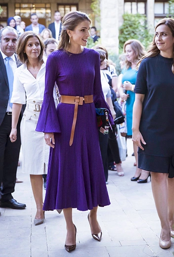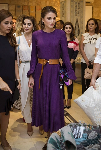 Как мы уже сказали, поддержка женщин — важная часть миссии иорданской королевы. 12 сентября Рания открыла 22-ую ежегодную выставку фонда Jordan River Foundation, на которой были представлены произведения, созданные местными ремесленницами. В этот день королева отказалась от брюк в пользу лилового платья от Ellery, дополнив его туфлями от Jimmy Choo и коричневым кожаным ремнем от Rag & Bone: Рания как никто чувствует уместность наряда.