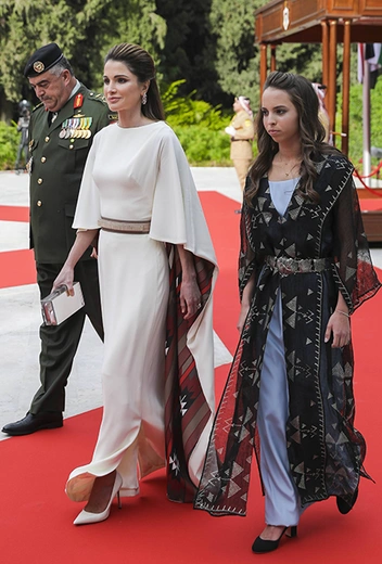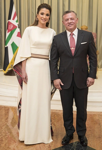 Поистине королевское платье Рания продемонстрировала 25 мая, когда она и ее супруг, король Абдалла II Ибн Хуссейн, посетили национальный праздник — 71-ю годовщину независимости Иордании в дворце Рагадан. Ее Величество облачилась в летящее сливочное платье с длинной накидкой, на обратную сторону которого нанесен рисунок в национальных узорах.