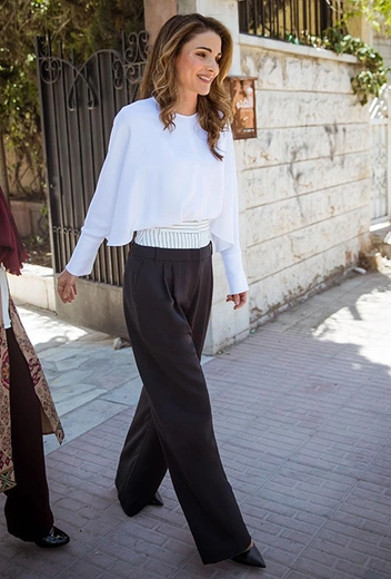 Если в прошлый раз брюки не походили на мужские даже издалека, то на день матери в Аммане Рания надела широкие серые брюки из костюмной ткани с защипами — типично мужской фасон. Чтобы избежать неверной коннотации такой пары (в мусульманской моде это важно), Рания сочетает их с розовым жакетом от Fendi, для пущего эффекта добавив красный мессенджер Proenza Schouler. Чего не найти в гардеробной Ее Величества, так это обуви на плоском ходу: лодочки — неизменный спутник любого наряда иорданской королевы.