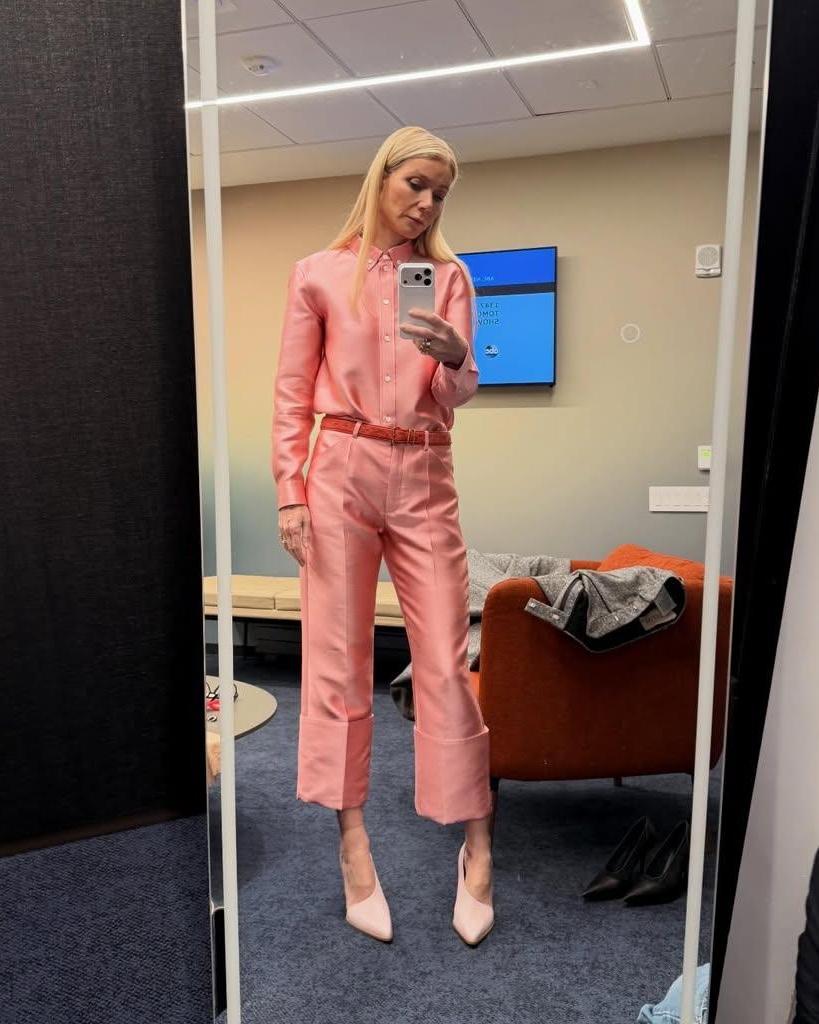 Главный модный жест Эппл — тот самый выход на пресс-показ фильма «Марти Великолепный» в винтажном черном платье Calvin Klein из гардероба Гвинет, в котором актриса ходила на премьеру «Эммы» в 1996‑м. На красной дорожке она повторяет силуэт максимально аккуратно: гладкое черное платье‑колонна, открытая спина, минимум украшений, собранные волосы и чистый нюдовый макияж с тонкой стрелкой. Это грамотно выстроенный мост между двумя поколениями it‑girls: Пэлтроу 1990‑х и Мартин 2020‑х (читайте также: Какой модный след оставил фильм «Марти Великолепный»).