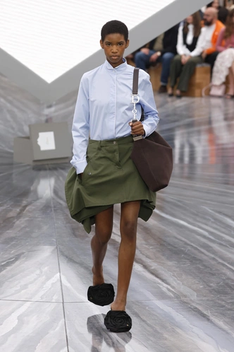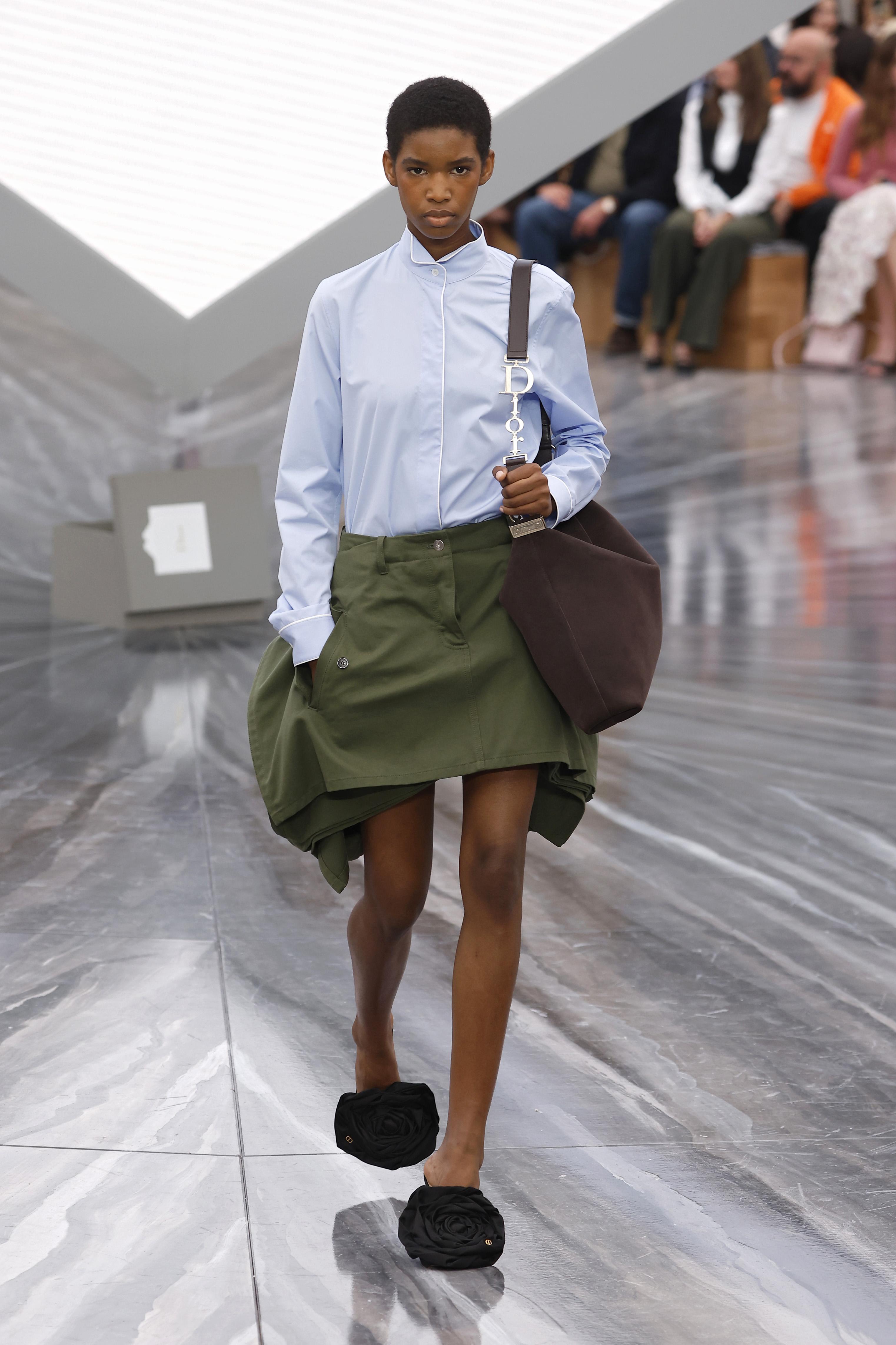 Помимо тотал-луков, не менее интересно рассматривать и детали. Лодочки с небольшими заячьими ушками и распустившимися розами намекают на любовь Андерсона к природе, а обувь с крупными буквами C и D заявляет о том, что вещами от Dior нужно гордиться. Вообще, это один из главных лейтмотивов, который идет еще с мужского показа Джонатана Андерсона для Dior. Своими отсылками к викторианской эстетике, кампанией с Майки Мэдисон, задумчиво прогуливающейся в прекрасных садах резиденции Жанны Дюбарри, сумками Lady Dior с объемными ромашками и клевером Андерсон создает из Дома мечту, к которой хочется не просто прикоснуться — в которую нужно нырнуть с головой.