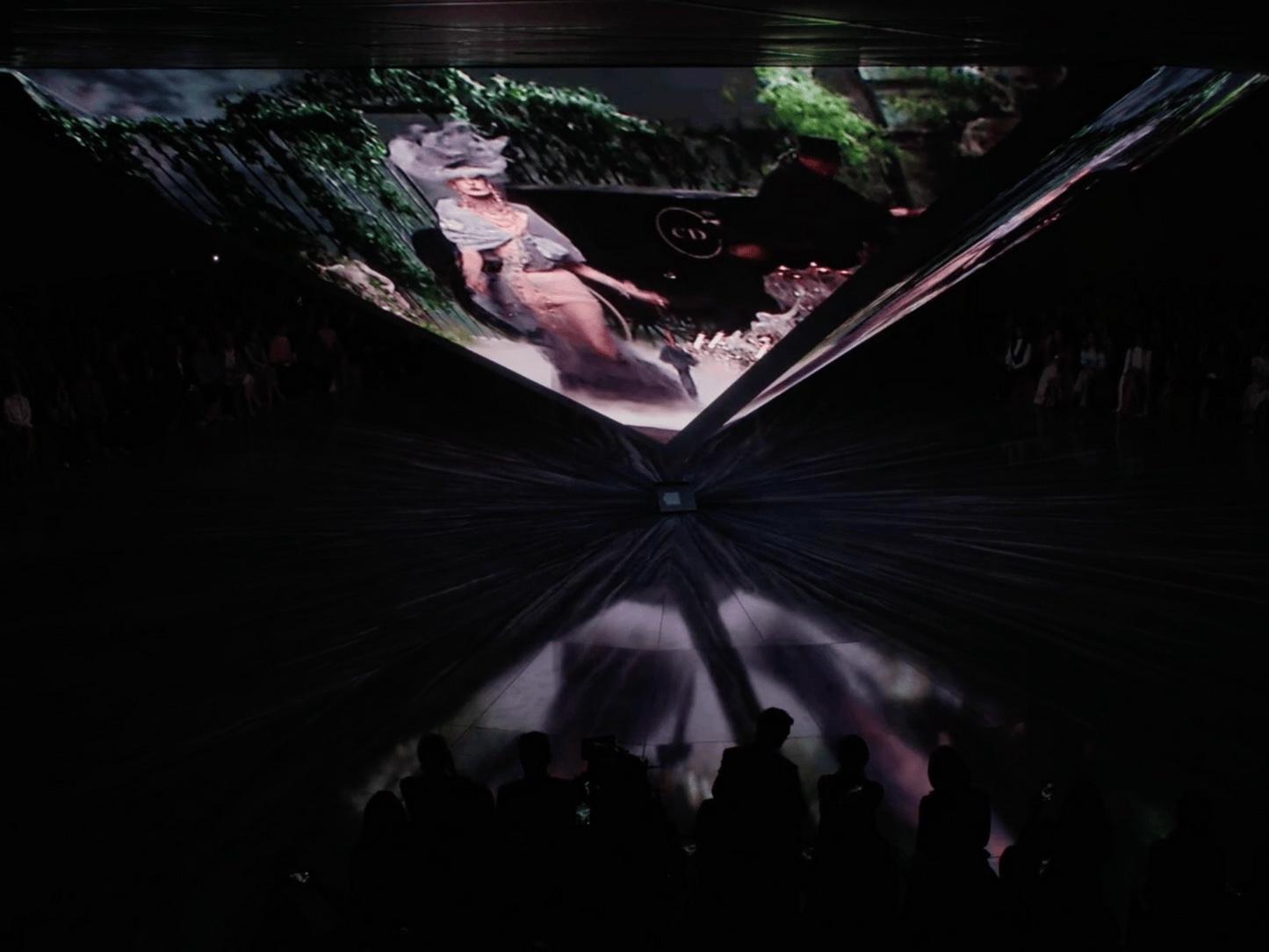 Начальные секунды показа зрители провели в настораживающей темноте, после чего посреди зала зажегся экран: словно ограненный бриллиант, он «прорастал» из коробки для обуви Dior, погрузив нас в самые важные вехи в истории Дома.