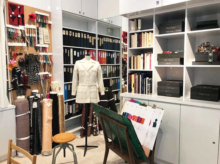 На втором этаже, минуя секцию «Посвящение моде», где представлены опыты кутюрье с историческими костюмами, вы попадете в самую захватывающую часть экспозиции — кабинет самого Сен-Лорана. Он, естественно, остался практически в первозданном виде, сохранив ту атмосферу, что требовалась Сен-Лорану для творчества: большое пространство, яркий свет и зеркала от потолка до пола. Любая вещь сначала отшивалась в белом хлопке, чтобы дизайнер мог понимать, как она будет смотреться на теле. Такой макет назывался toile, и их Сен-Лоран разглядывал в эти самые зеркала, заставляя модель ходить взад и вперед по его кабинету.