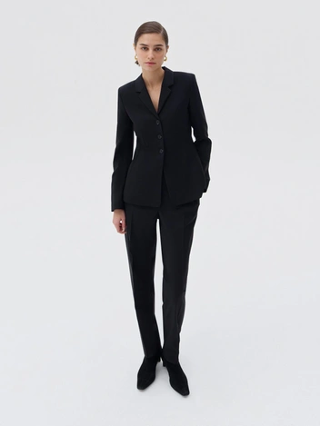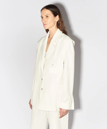 В эру повсеместного оверсайза не так-то просто найти хороший жакет с regular fit. У Ushatava таких несколько, включая двусторонний жакет со съемными подплечниками на кнопках. В костюмной группе бренда есть также варианты изо льна и денима. На каждом костюме обязательно будет какая-то маленькая усложняющая деталь, придающая характер: например, необработанный край, кожаная нашивка или чуть удлиненные разрезы на рукавах, благодаря которым их можно красиво и легко подворачивать.