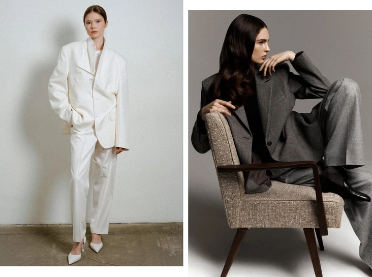 За брендом стоит стилист Ольга Реброва. А те, кто умеет одевать других, точно знают, чего не хватает людям, да? В вещах Sanchy все продумано: основная идея в том, что строгие мужские формы в коллекциях комбинируются со спокойными feminine-силуэтами. Жакеты выглядят собранно — и не оверсайз, и не прилегают. Брюки на высокой талии и с защипами, есть и укороченные модели. У всех костюмов хороший состав преимущественно из натуральных материалов.
