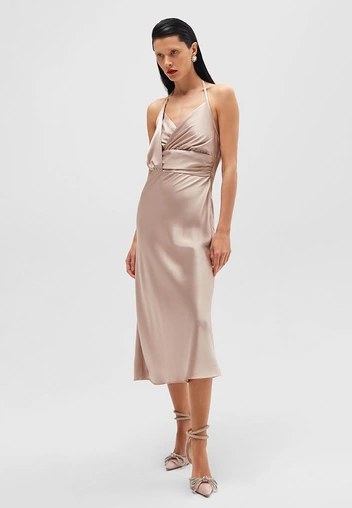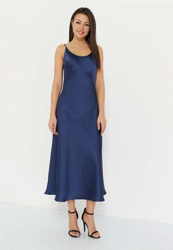 Если вы отмечаете дома, то встретить Новый 2024 год можно в атласном платье в бельевом стиле: это удобный и одновременно красивый вариант, который легко превратить в образ на выход. Дополните комбинацию массивными украшениями: серьгами-кольцами в стиле Хейли Бибер, жесткими браслетами или цепью с крупными звеньями. Не забудьте про обувь — пусть ваш домашний наряд дополнят стильные мюли или блестящие босоножки.
