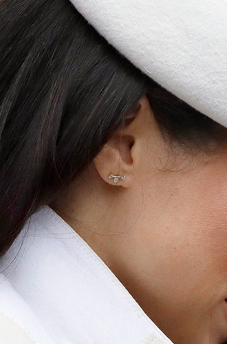 Вопреки неписанным правилам, Меган надела только одну серьгу. Что ни говори, а Виндзоры приобрели в семью герцогиню, способную ломать стереотипы.Серьги Triple Shooting Star от Gabriela Artigas: £215