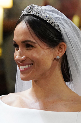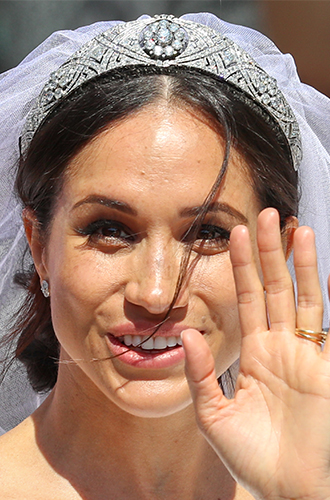 Бриллиантовая тиара (во временном пользовании): £450 000 Каждой принцессе необходима тиара и свою Меган получила в день свадьбы из коллекции Ее Величества. Украшение из 11 секций и массивной бриллиантовой брошью в виде цветка в центре принадлежала королеве Мэри и перешла Елизавете II по наследству.Бриллиантовая тиара (во временном пользовании): £450 000