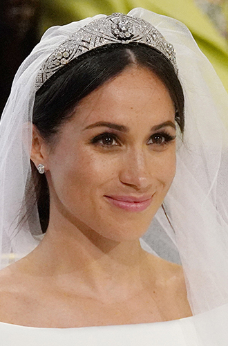 Бриллиантовая тиара (во временном пользовании): £450 000 Каждой принцессе необходима тиара и свою Меган получила в день свадьбы из коллекции Ее Величества. Украшение из 11 секций и массивной бриллиантовой брошью в виде цветка в центре принадлежала королеве Мэри и перешла Елизавете II по наследству.