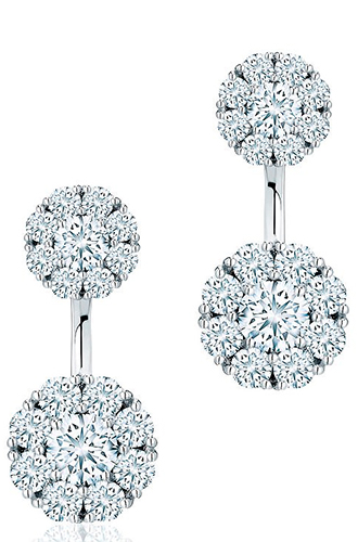 Серьги изготовлены из 18-каратного белого золота и четырех крупных бриллиантов, в окружении бриллиантов поменьше.