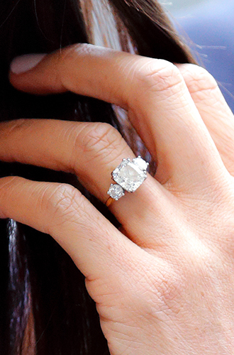 Украшение изготовлено по персональному дизайну Гарри ювелирами Cleave & Company. Центральный бриллиант в 3 карата из Ботсваны – напоминание о первой романтической поездке пары...