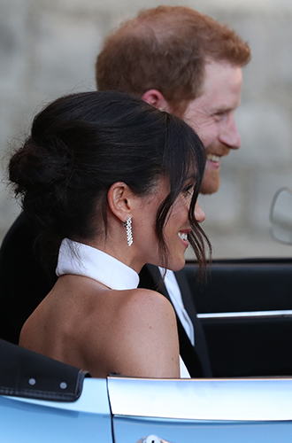 Серьги из той же коллекции, что и браслет, блиставший на запястье во время венчания, Меган надела для свадебной вечеринки.Бриллиантовые серьги-шандельеры от Cartier: £60 000